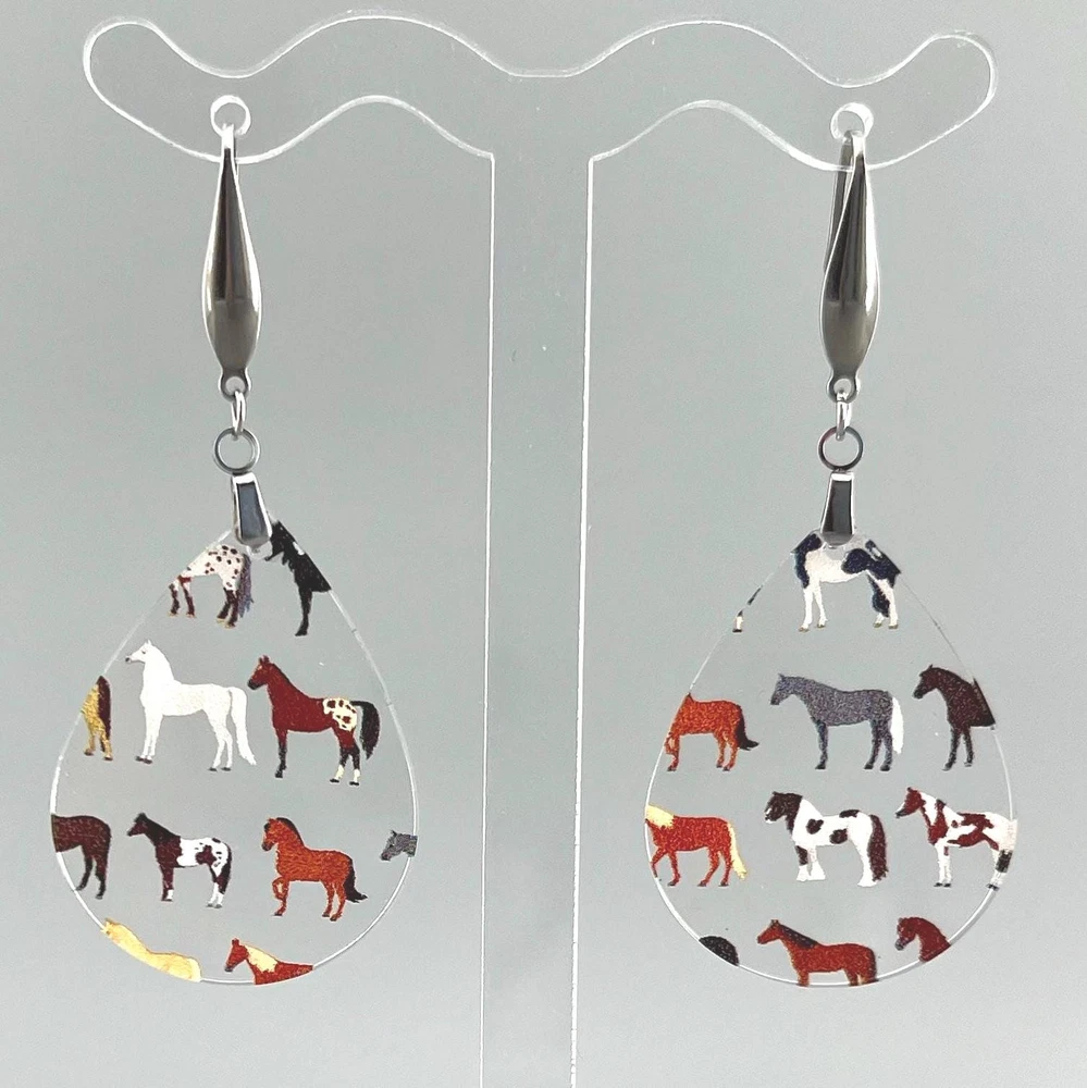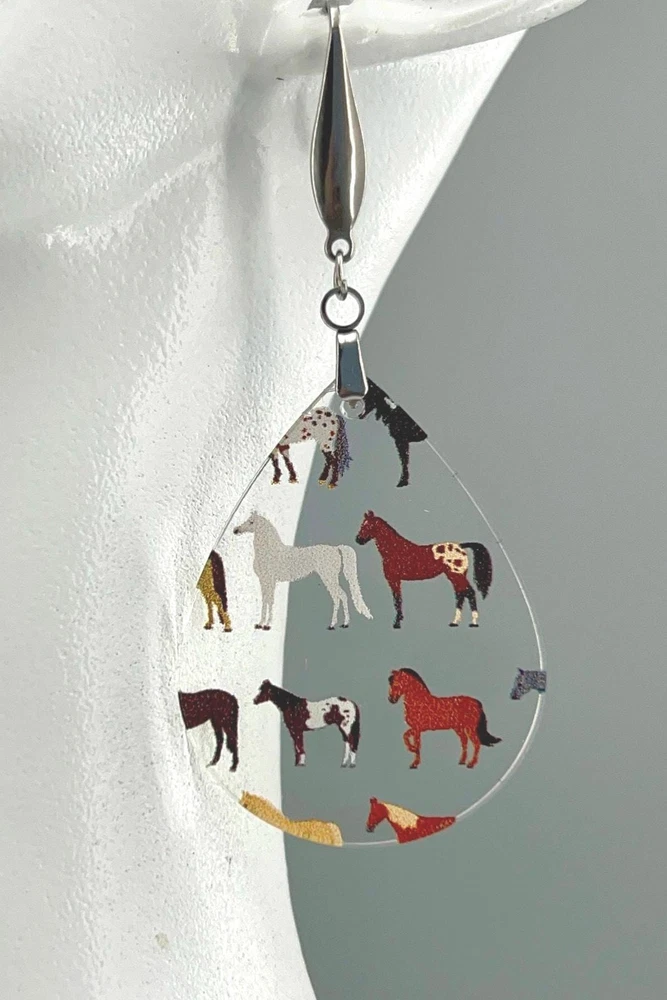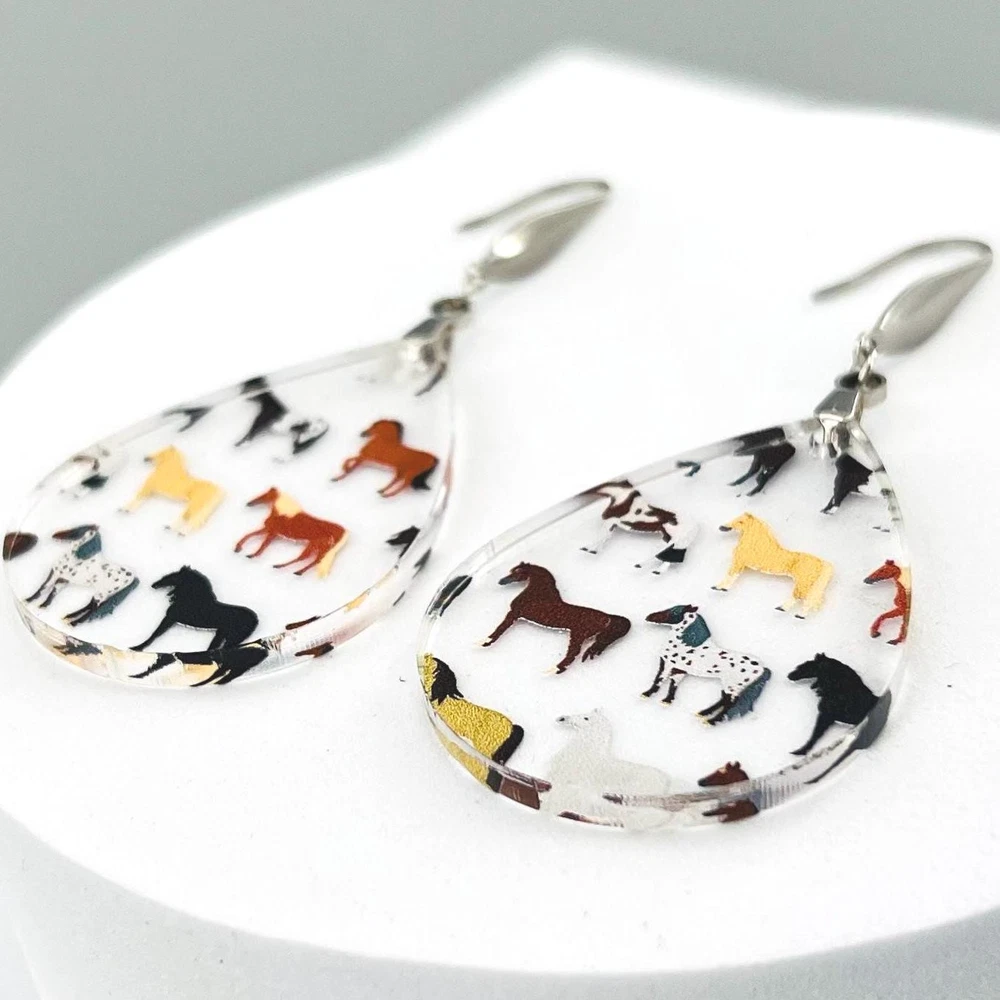 Add a touch of country charm to your look with these fun horse earrings! Perfect for the equestrian or horse lover in your life, these animal earrings will make a great gift for her. Whether you're heading to the rodeo or simply embracing your inner country girl, these unique horse jewelry pieces are sure to impress. Lightweight Acrylic Earrings on a Stainless Steel hook. Earring hardware is stainless steel and nickel/lead free. 🌟(Please see item details/highlights/pictures for size information)🌟 Each earring is laser cut from acrylic and assembled by hand in our studio. 🌟Due to variation in the patterns and handmade processes, each earring will vary earring to earring. No two earrings will be identical but will look similar to what is pictured! Each pair of earrings comes on an earring card with silicone backers and packaged in an organza bag. Perfect for gift giving! We currently do not offer more gift-wrapping options. Shipping: All purchases are shipped in a box with tracking so that they arrive safely to you! Currently we only ship to US postal addresses. We have a set standard shipping time of 1-3 business days from the time your order is placed. Everything in our shop is already handmade and ready to ship FAST! Please be aware that unexpected delays can occur, which you will be notified at the time of any such occurrence. Jewelry Care: 🌟Each piece is delicate! Avoid dropping or bending! 🌟Do Not expose to excessive moisture, please remove jewelry before showering, swimming, and sleeping. 🌟Avoid abrasives, perfumes, lotions, excessive heat, chemicals etc. These may deteriorate your jewelry and may damage its appearance. 🌟Clean with the soft cloth we have included in your package (and it is FREE of Charge!) No Returns: Due to hygienic and safety reasons, ALL SALES ARE FINAL. We DO NOT accept returns. In the event you have an issue with your purchase, please feel free to message us on Etsy to discuss any possible resolution.