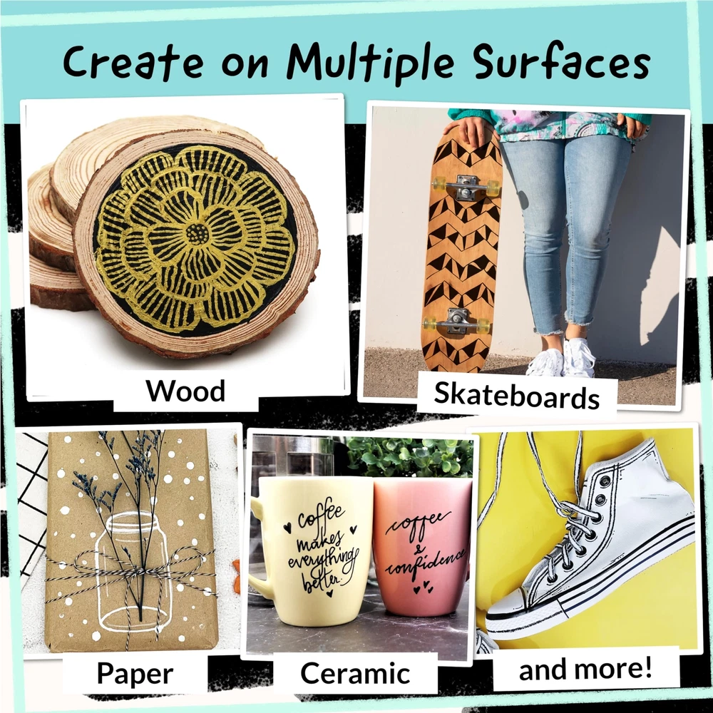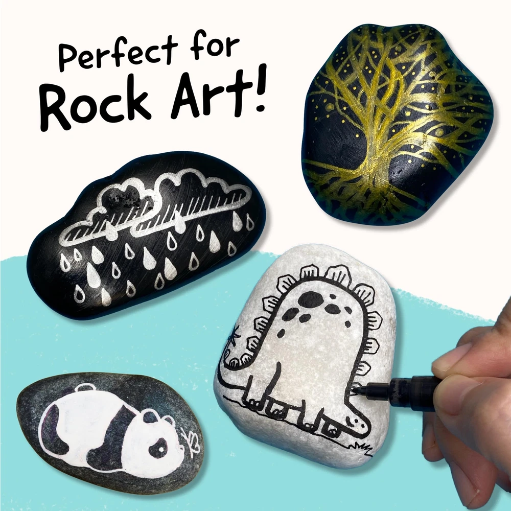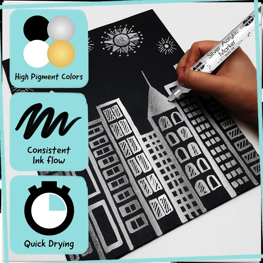 Acrylic Markers - Highly pigmented, Quick to dry & used as paint markers for canvas, paint pens for wood, or as glass paint markers, rock painting pens, on wine glasses & ceramic paint pen (dishwasher safe ink) Quick Drying & Water Based - Fine Point Paint pens, features smooth colors to produce true, consistent shades and are resistant to water, fading, and abrasion. Use these wood paint pens & rock painting markers to create personalised messages. Multiple Use - Get creative with DIY painting & crafts using these acrylic paint pens for canvas, fabric paint pens for clothes, metal, porcelain, plastic, stones, polymer clay, as paint markers for wood, paint markers for metal Dual Tip Paint Marker - Extra Fine tip Paint Pens (1mm) and Medium Bold Felt tip (5mm) - Thin point is well-suited for precise work or hand lettering & Medium Bold tip used for filling in large areas. 4 Ink Colors - White Paint Pen, Black Paint pen + Two Metallic Paint pens - Gold Paint Pen & Silver Paint Pen. Acrylic Dual tip Permanent Markers for all outdoor & indoor projects. Non-Toxic & Long Lasting Acrylic Pens - While other acrylic pen crack under heavy use, our richly pigmented acrylic paint marker pens set stays fray free. Conform to ASTM D-4236 and EN-71.