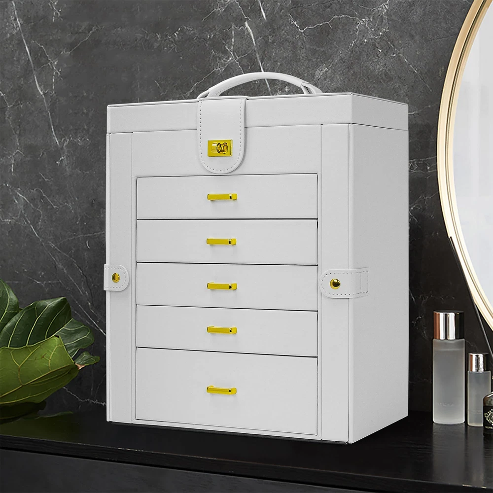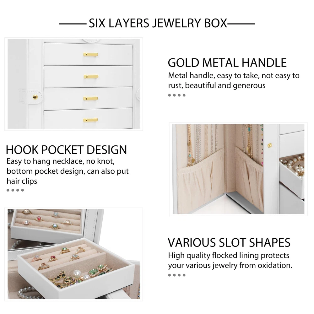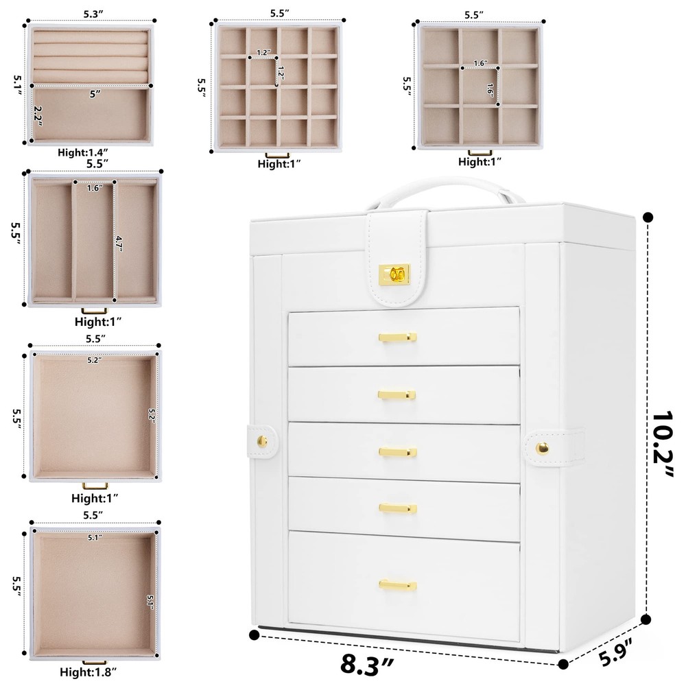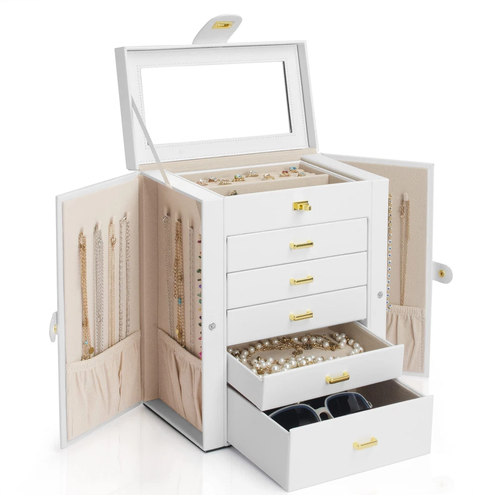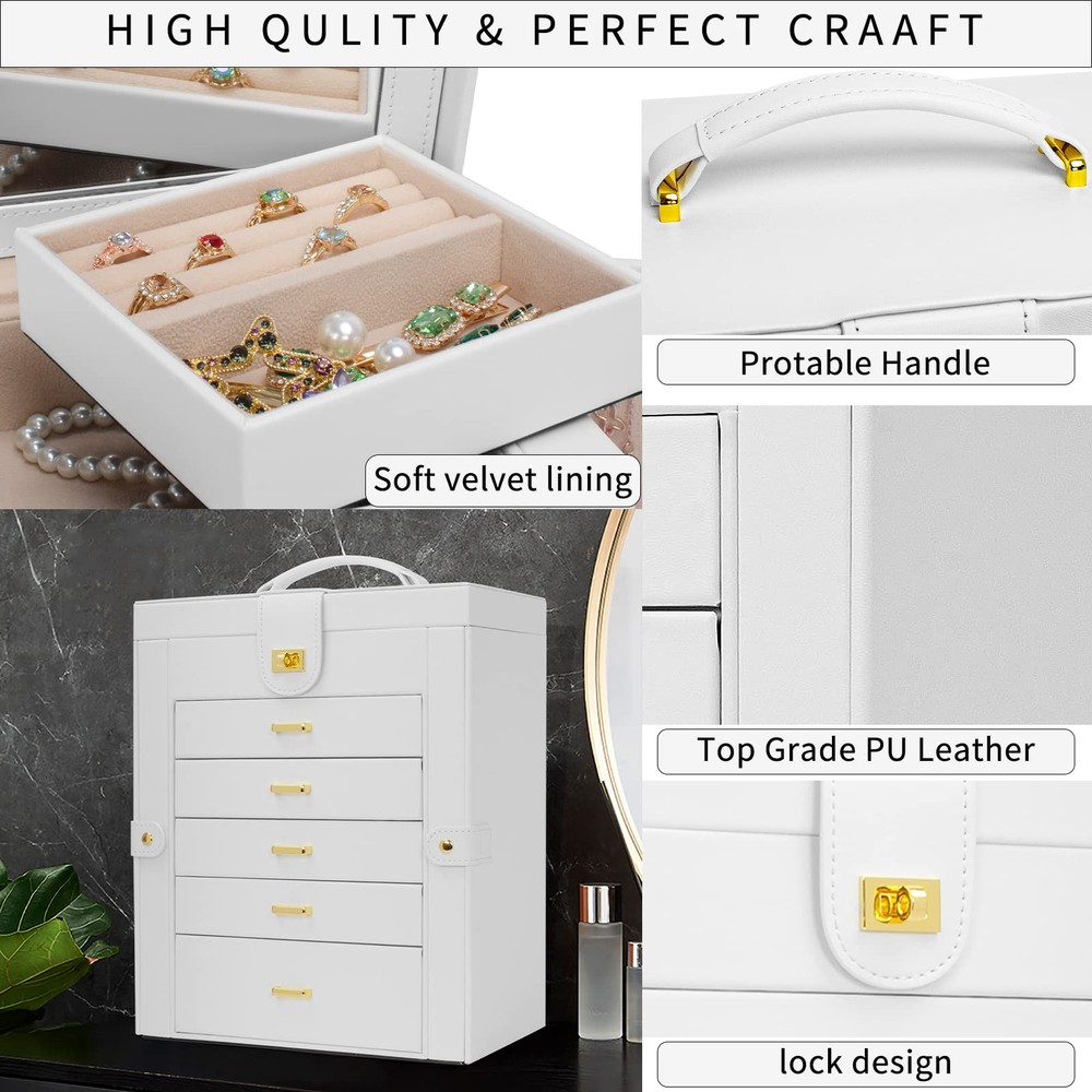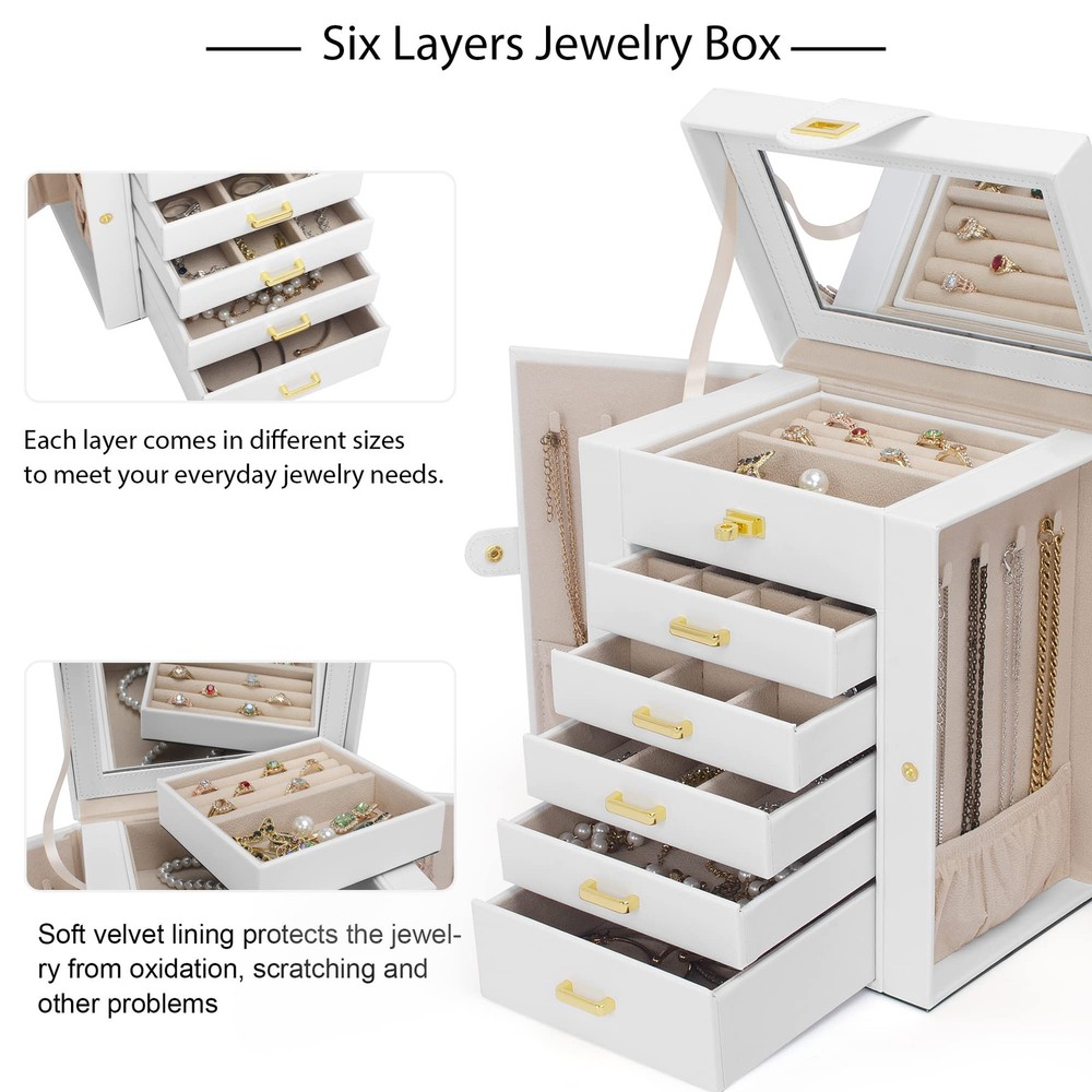 Elegant Durable, Attractive appearance with leather surface and soft velvet lining. Sturdy construction and quality material make it very durable. The jewelry holder can tidy your table and protect your precious jewelry for a very long time .Material: MDF(Medium Density Fiberboard),Velvet,Faux Leather Large Mirror, This mirrored jewelry box comes with a built-in large mirror on top lid, making it easier to dress yourself. The lid has a ribbon attached to keep it from falling back. With a grab-and-go handle, convenient to carry around; delicate buckle for one-hand easy opening, easy to use and saving your time LARGE CAPACITY, With 6 versatile pull out drawers, this white jewelry box can store a lot of jewelry accessories, such as rings, earrings, necklaces, chains, bracelets, and so on 6 LAYERS, With 5 Versatile Pull Out Drawers 2 Hidden Side Cabinets, The top layer is a removable ring layer With big mirror,The two deeper bottoms of the 5 removable drawers has only one compartment; Drawer 1 has 16 equal size slots; Drawer 2 has 9 equal size slots; Drawer 3 has 3 equal rectangle size slots. The 2 Swing out Cabinets including 8 hooks and 2 pockets, help to keep your necklaces from getting tangled Nice Present, Jewelry Organizer is nice choice for Valentine's Day, Mother's Day, Thanksgiving Day, Birthday and Wedding. Suit for Mother, Girlfriend, Wife, Daughter and So On