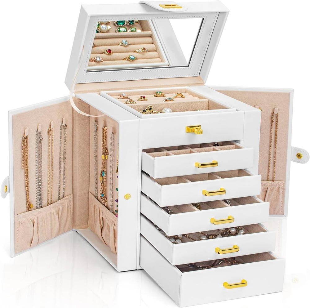 Functional 6-Tier Jewelry Box Organizer with 5 Drawers Leather Jewelry Storage Case for Women Girls Ring Necklace Earring Bracelet Holder Organizer with Mirror White Elegant Durable, Attractive appearance with leather surface and soft velvet lining. Sturdy construction and quality material make it very durable. The jewelry holder can tidy your table and protect your precious jewelry for a very long time .Material: MDF(Medium Density Fiberboard),Velvet,Faux Leather Large Mirror, This mirrored jewelry box comes with a built-in large mirror on top lid, making it easier to dress yourself. The lid has a ribbon attached to keep it from falling back. With a grab-and-go handle, convenient to carry around; delicate lock catch for one-hand easy opening, easy to use and saving your time LARGE CAPACITY, With 6 versatile pull out drawers, this white jewelry box can store a lot of jewelry accessories, such as rings, earrings, necklaces, chains, bracelets, and so on 6 LAYERS, With 5 Versatile Pull Out Drawers 2 Hidden Side Cabinets, The top layer is a removable ring layer With big mirror,The two deeper bottoms of the 5 removable drawers has only one compartment; Drawer 1 has 16 equal size slots; Drawer 2 has 9 equal size slots; Drawer 3 has 3 equal rectangle size slots. The 2 Swing out Cabinets including 8 hooks and 2 pockets, help to keep your necklaces from getting tangled Nice Present, Jewelry Organizer is nice choice for Valentine's Day, Mother's Day, Thanksgiving Day, Birthday and Wedding. Suit for Mother, Girlfriend, Wife, Daughter and So On ’s Craftsman’s Spirit Creation is between the hands.