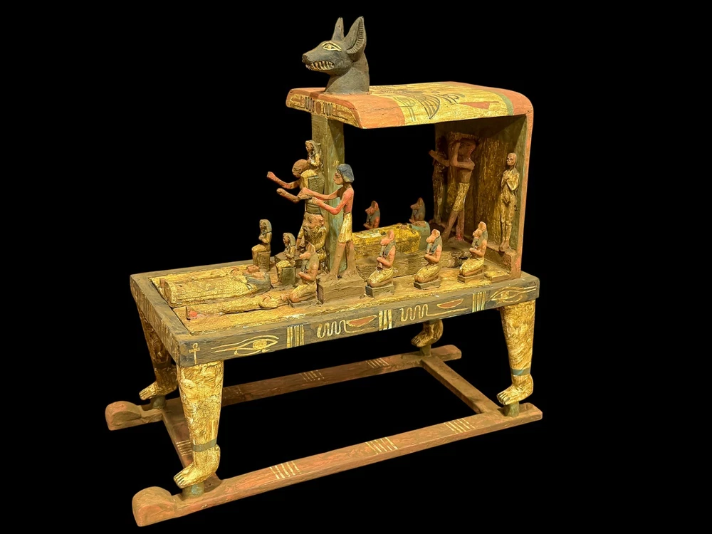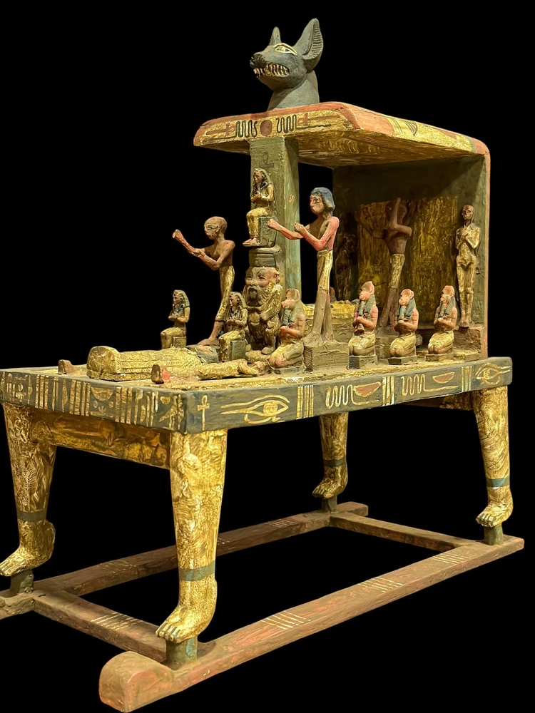 The Funeral Boat of God Anubis statue in the Egyptian Museum is a beautifully crafted replica of a royal memorial artifact. Made of wood and showcasing intricate details, this antique-style piece embodies the rich history and artistry of ancient Egypt. The multi-color craftsmanship adds a touch of authenticity to this vintage reproduction, making it a unique and decorative collectible for any Egyptian history enthusiast or collector of unique artifacts. Please note: The original value of this piece is $1500 . However, due to eBay’s restriction on listing items above $500, we have listed the item at $499 and included the remaining value within the shipping fees.
