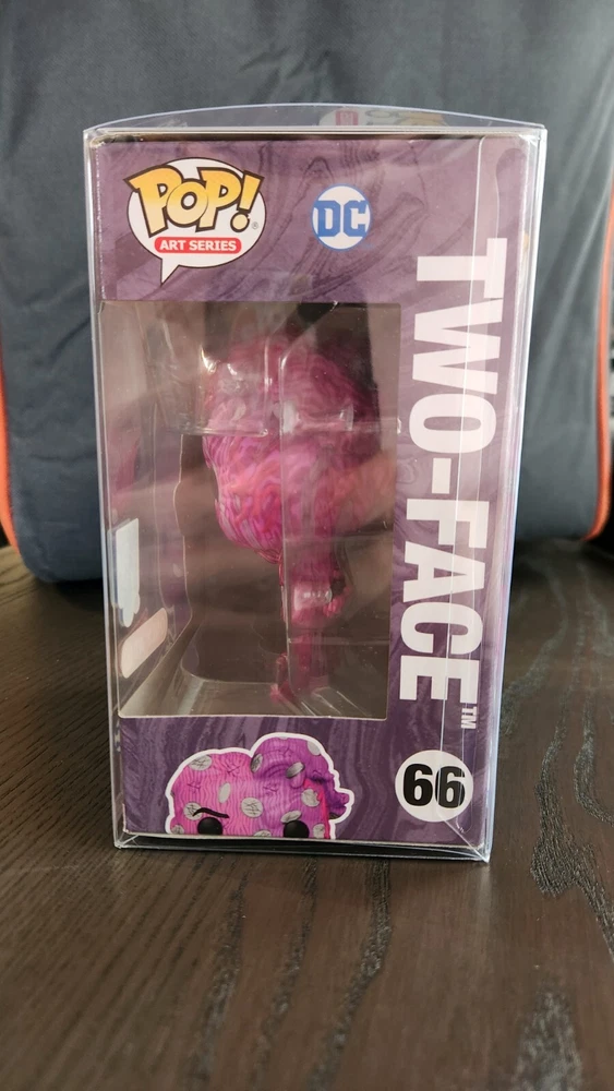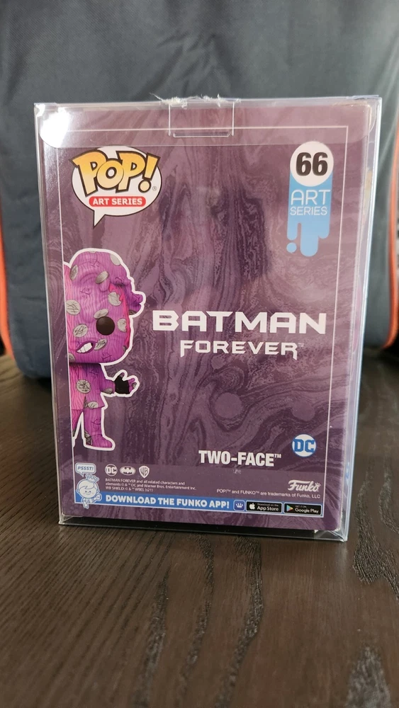 This Funko POP vinyl figure features the iconic characters of Batman and Two-Face from The Batman movie. The figure stands at 6.5 inches tall and is part of the DC Comics Series 1 collection. It comes with a hard case and is an exclusive item from Target.The purple figure is made of vinyl material and has a weight of 1.260 lbs. It is graded a 100 by Action Figure Authority (AFA) and is gender neutral. The Funko POP is a vintage item and is part of the Art Series collection. It has features that make it exclusive and is perfect for collectors of collectible figures and bobbleheads.