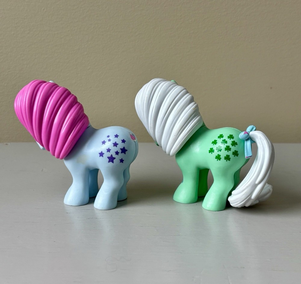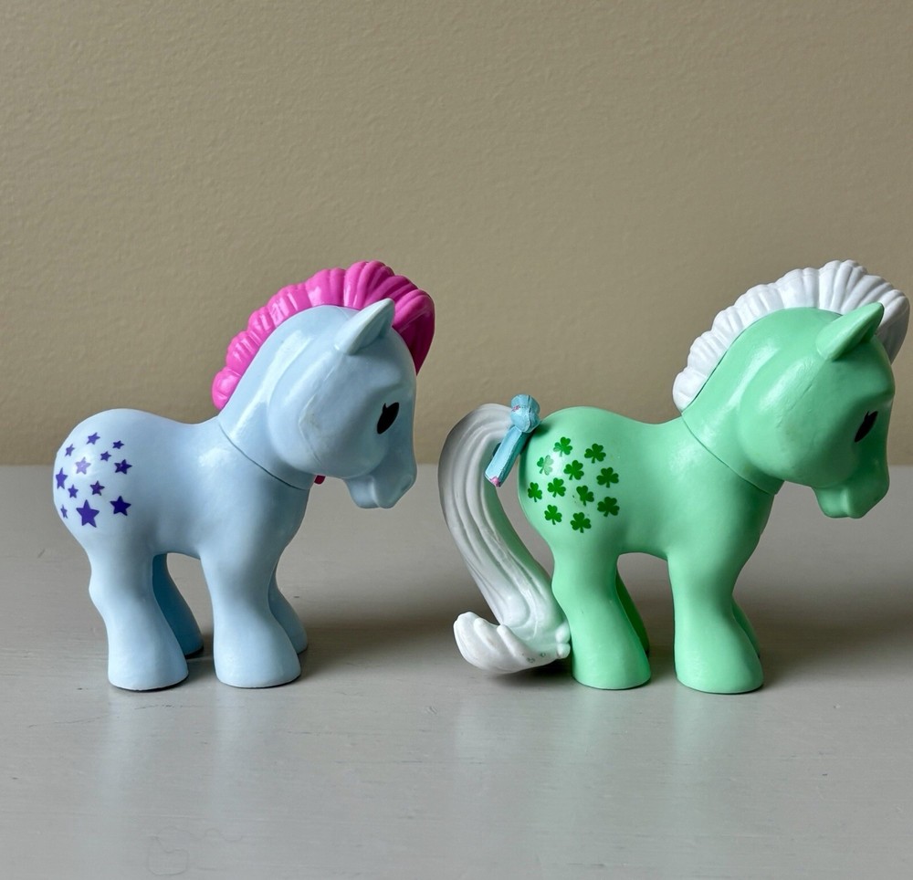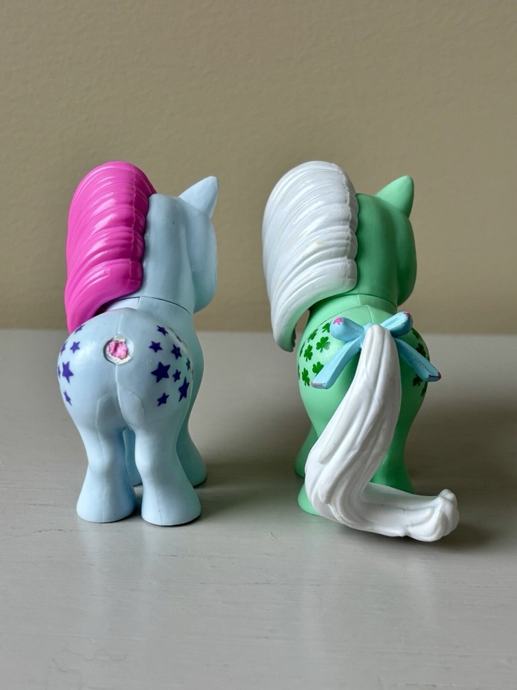 The product is a set of two Funko POP! vinyl figures featuring My Little Pony characters Minty and Blue Belle. Minty is identified as #62 and Blue Belle as #66, with Blue Belle noted as missing her tail. The figures stand at 3.5 inches tall and are part of a common rarity release from 2020. Both characters are depicted in shades of green and blue, staying true to their original My Little Pony designs from the franchise. The figures come without packaging and are a part of the modern Funko Pop product line.