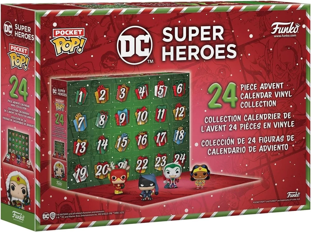 Get ready for the festive season with this Funko Pocket Pop DC Super Heroes Christmas Advent Calendar. Featuring iconic characters such as Superman and Batman, this original and licenced reproduction door advent calendar is perfect for any young DC Universe fan. Made from high-quality vinyl and designed with vibrant multicoloured accents, this advent calendar is sure to bring a smile to any child's face. The Funko Pocket Pop DC Super Heroes Christmas Advent Calendar is ideal for collectors and fans alike. With a year of manufacture of 2023, this advent calendar is a must-have for any holiday and seasonal occasion. Whether you're looking for a unique gift or simply want to add to your collection, this Funko Pocket Pop DC Super Heroes Christmas Advent Calendar is the perfect choice.