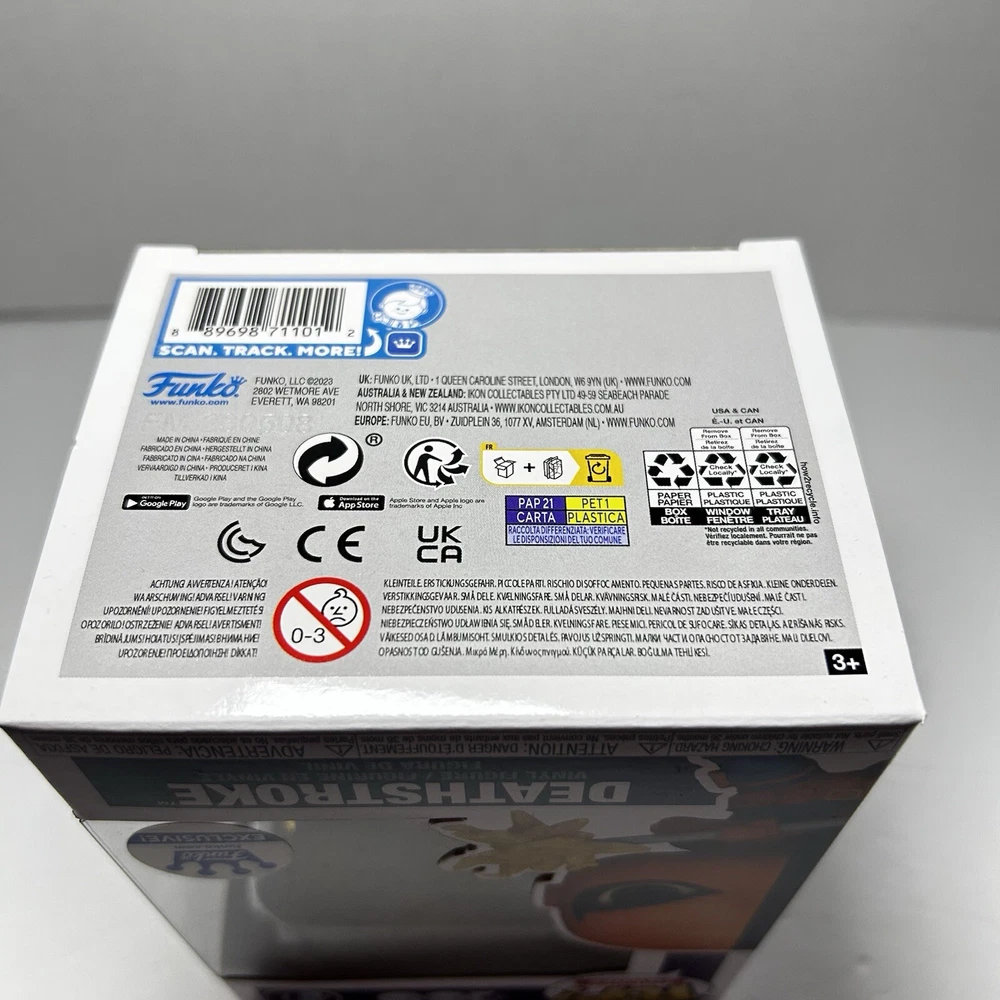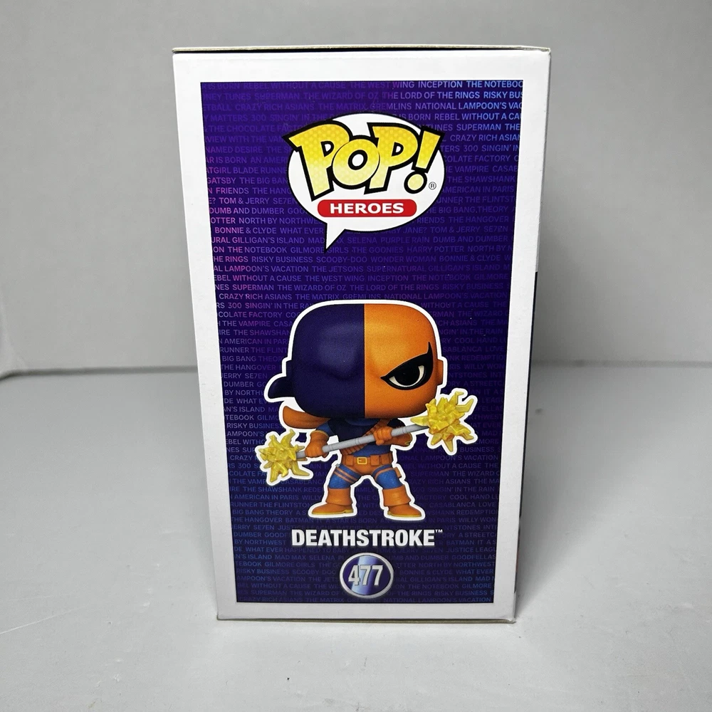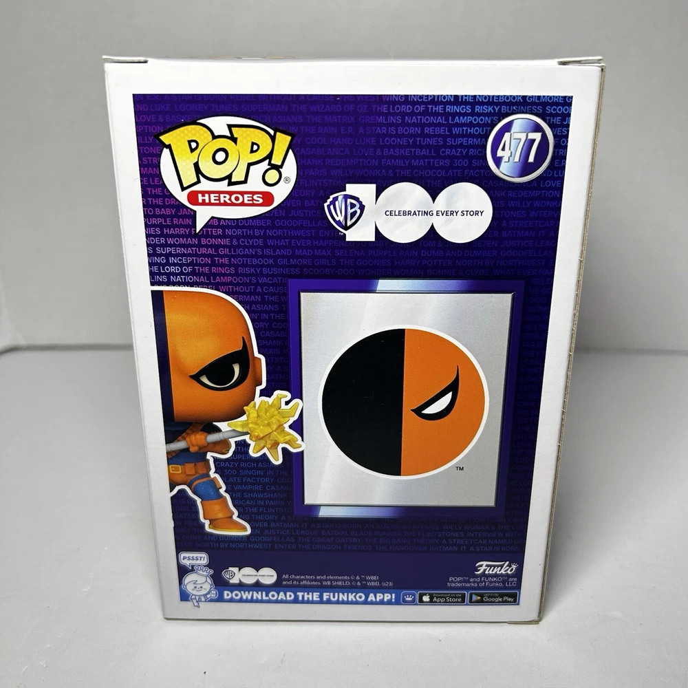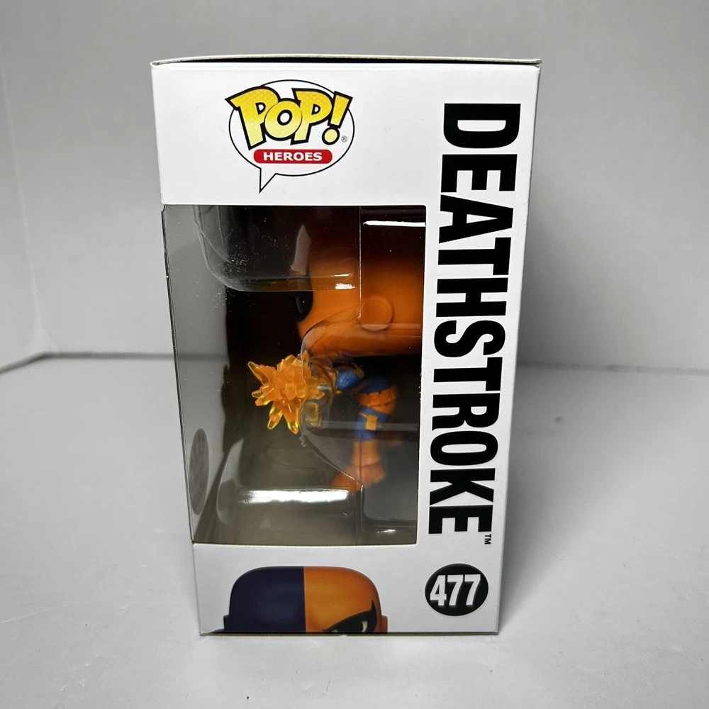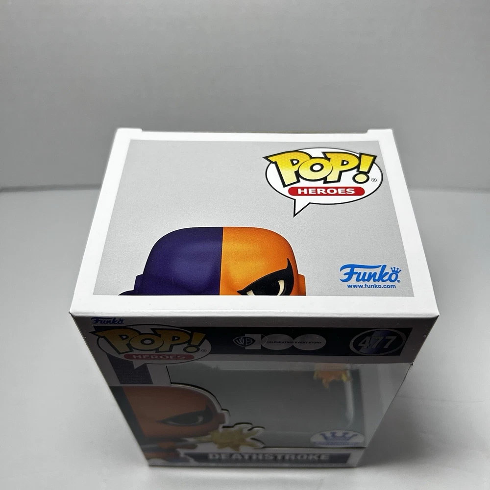 This is a Funko Pop! vinyl figure of Deathstroke, part of the DC Universe series. It is an exclusive release from Funko, specifically for Warner Bros. 100. The figure is vaulted and features the character Deathstroke from comic books. It is made of vinyl and comes in box number 477. Never opened