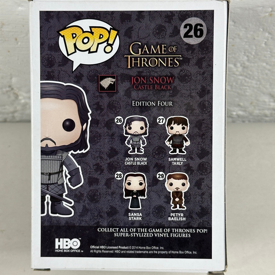 Embrace the world of Westeros with this Funko Pop! Game of Thrones: Jon Snow (Castle Black) Vinyl Figure #26! This collectible captures the essence of the heroic character from the hit series, detailed in black vinyl that highlights the figure's stark attire. With its vaulted status, this piece is a must-have for enthusiasts seeking to complete their Funko GoT collection.Crafted by Funko, this Pop! Vinyl figure comes from the renowned Game of Thrones Series 4, and it's designed to impress with its intricate details and sturdy construction. Whether you're a fan of the fantasy genre, a dedicated collector, or simply admire the intricate craftsmanship of Funko products, this Jon Snow figure is a standout addition to any collection. This Funko Pop! is new, unopened, in great condition, in its original packaging, comes in a protective case/sleeve and is ready to ship to a new home today!