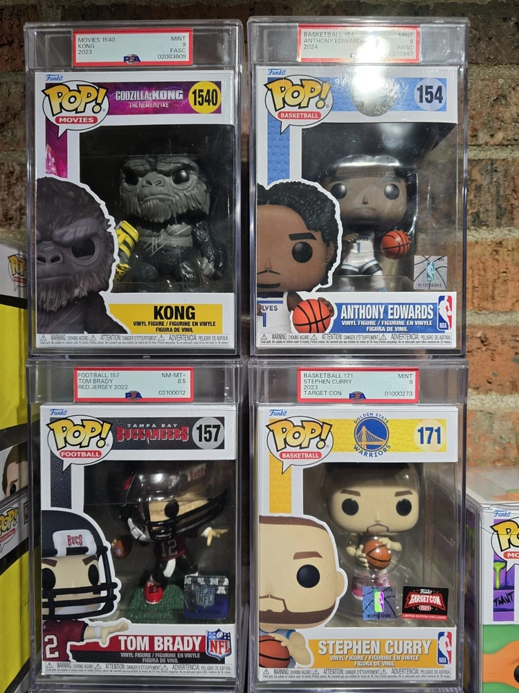 This Funko Pop! lot includes 8 vinyl figures featuring popular sports personalities like Tom Brady, Stephen Curry, and promising young talents like Wembanyama and Kong. The collection is part of the Pop! product line from Funko, known for their detailed and collectible figures. The figures are graded as PSA 9, ensuring their quality and value for collectors who are fans of football and basketball.