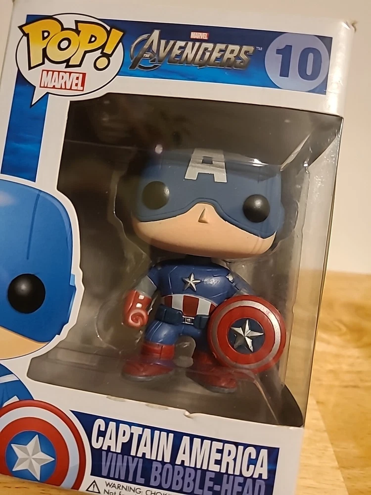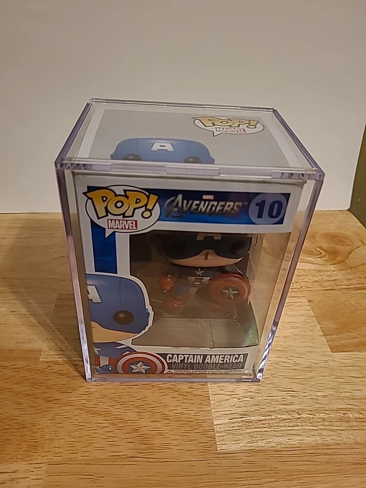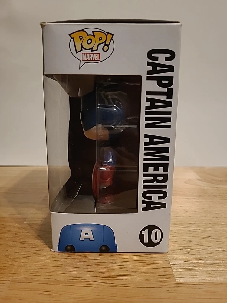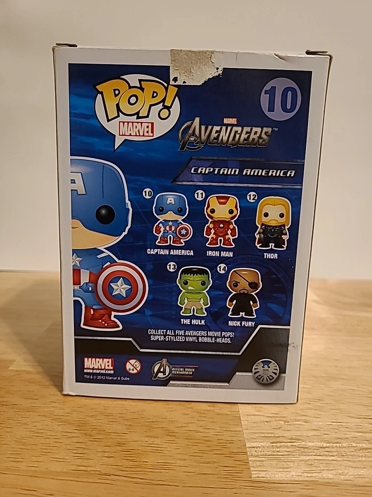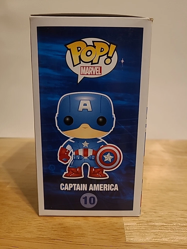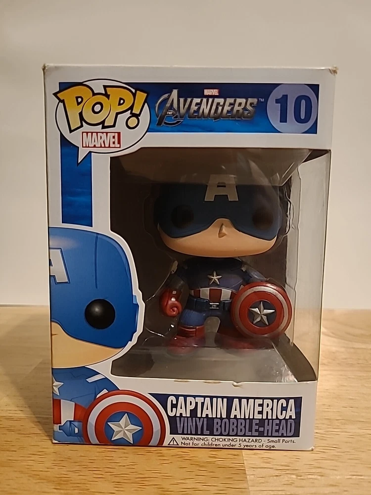 This Funko Pop! vinyl bobblehead features Captain America from Marvel's The Avengers franchise. The figure is made of high-quality vinyl material and comes in a classic blue color. It is part of the Pop! Vinyl product line and has a box number of 10. This particular model is from the 2012 release year and has the model number #10. In addition to being a great collectible for fans of the Marvel movies, this Funko Pop! comes with a hard stack to ensure it stays in pristine condition. Minor box damage. With its vaulted status, this bobblehead is sure to be a valuable addition to any Marvel or Funko collection.