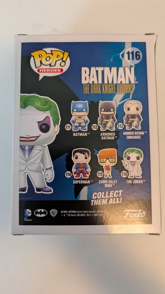 Step into the world of Gotham with the Funko Pop! Joker figure from the Dark Knight Returns series. This exclusive #116 vinyl collectible, still in its original unopened packaging, captures the iconic villain in his classic multicolor attire, poised to bring a touch of chaos to your collection. With its release in 2016, this piece has become a must-have for fans of the DC Universe and Funko collectors alike. Crafted with care, the figure stands at 7 inches and is part of the Pop! Vinyl product line. It's a non-customized, standard-sized item that fits perfectly on shelves or desks, making it an ideal addition for both serious collectors and casual fans. Celebrate your love for the Dark Knight and the Joker with this unique Diamond Comics exclusive that stands out in any collection.
