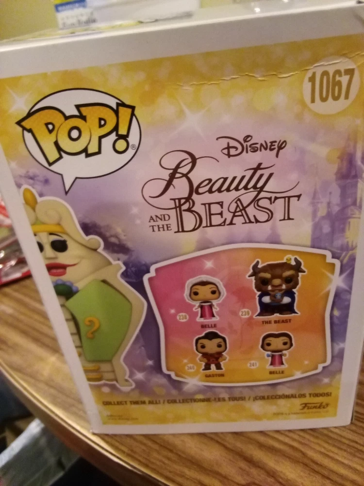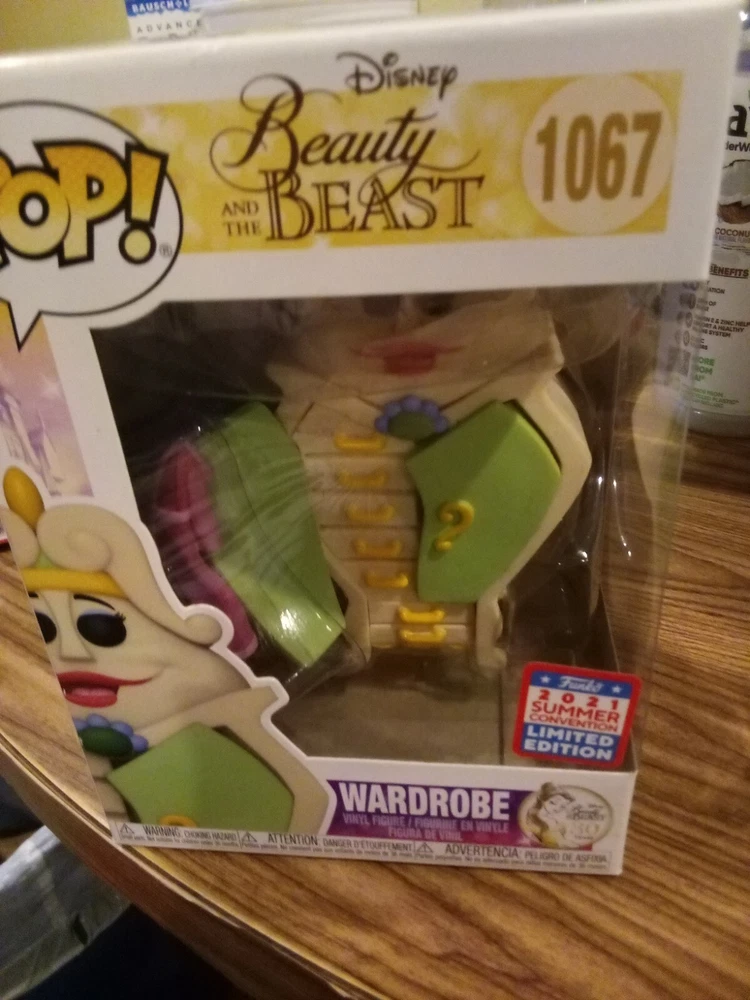Introducing the Funko Pop! Vinyl figure of Wardrobe from Disney's animated movies. This highly collectible figure is part of the exclusive 2021 SDCC/Funkon series and comes in a beautifully designed box with the box number 1067. The figure is made of high-quality vinyl material and features a vaulted design, making it a must-have for any Disney or Funko collector. This Pop! Vinyl figure is perfect for fans of Disney's animated movies and comics. It is an exclusive product from Box Lunch and San Diego Comic Con, making it a rare find. Add this highly sought-after figure to your collection today and complete your wardrobe of Disney and Funko collectibles. Nick on one side of the box😕