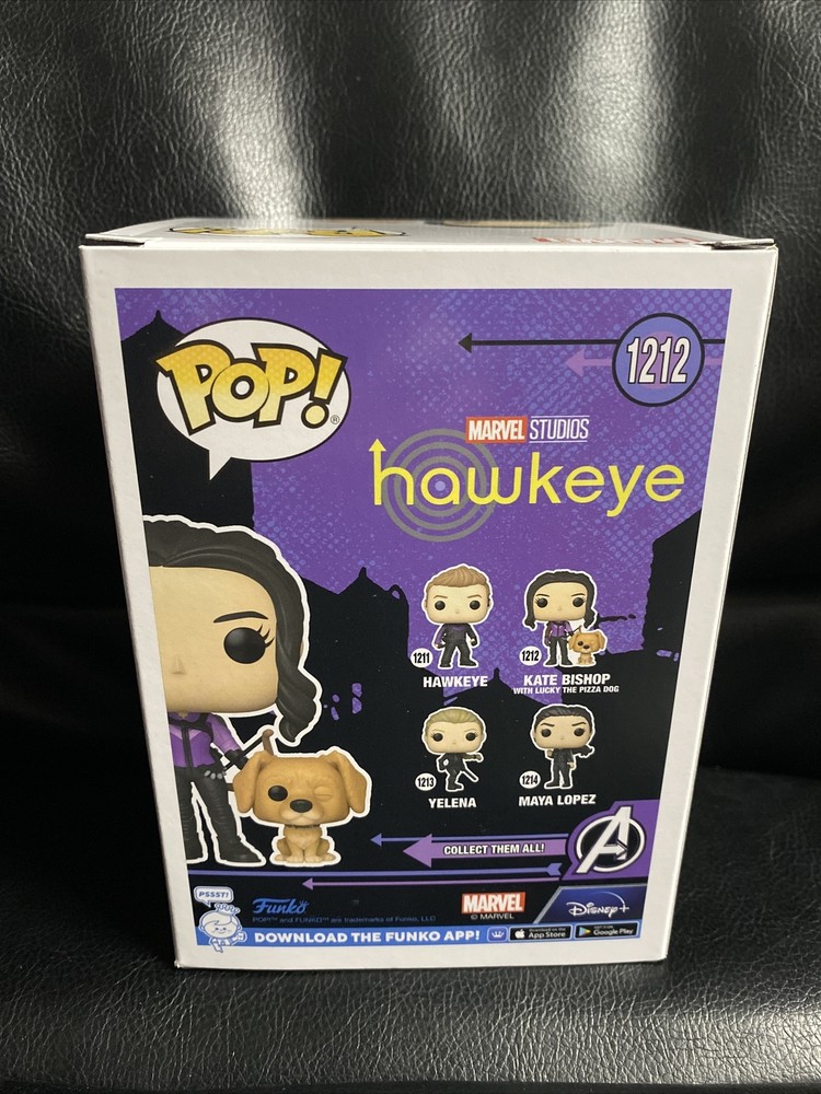 Series: Hawkeye Brand: Funko UPC: 0889698594813 Franchise: Marvel Theme: Comics, Television Type: Vinyl Figure, Pop! Vinyl Release Year: 2021 Box Number: 1212 Release Date: 12/20/2021 MPN: 59481 gtin13: 0889698594813 Collection: Marvel Display Name: Kate Bishop with Lucky The Pizza Dog Character: Kate Bishop Product Line: Pop! Vinyl