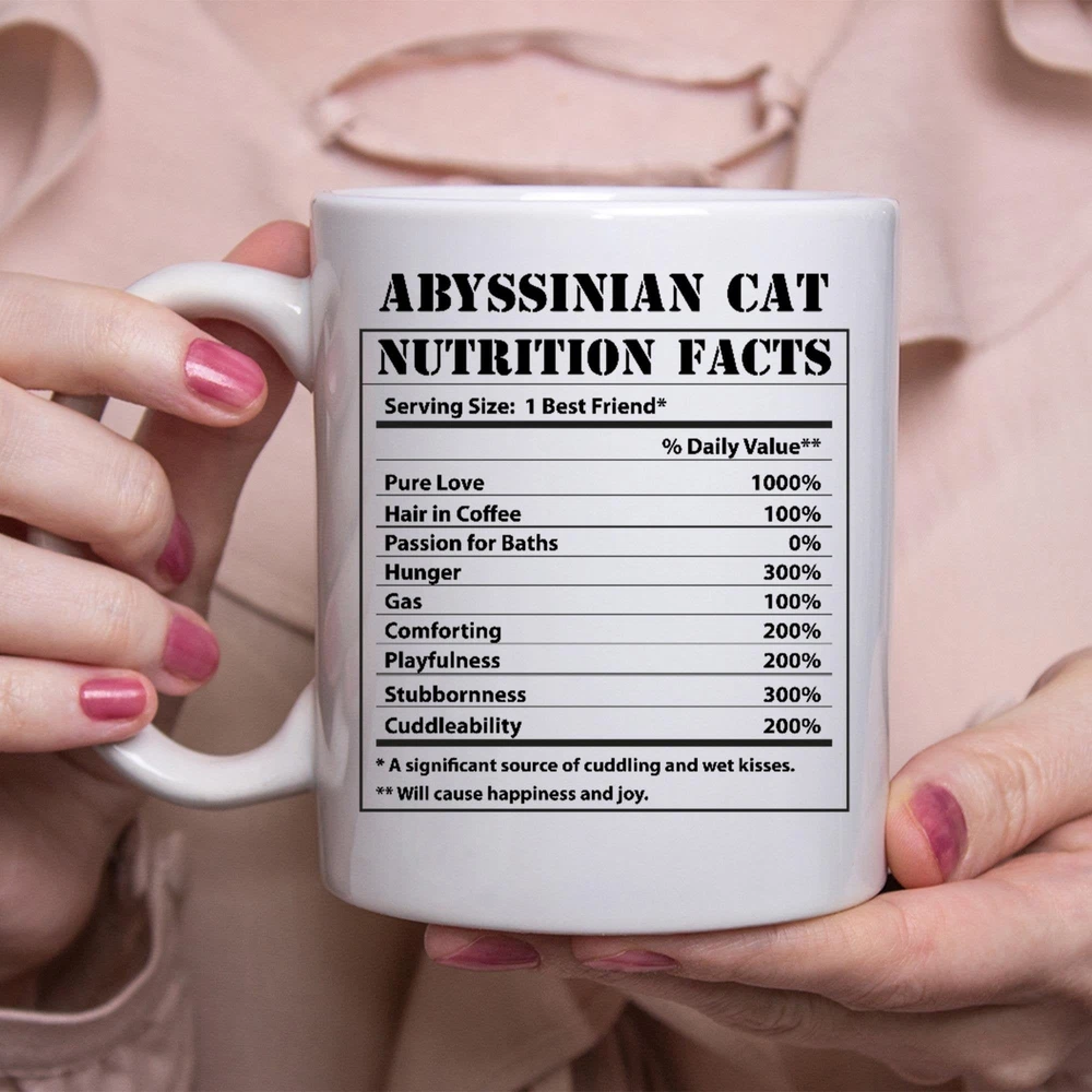 Funny Abyssinian Cat Gifts Nutritional Facts White Coffee Mug Product Details.. This high quality 11oz. ceramic white mug has a premium hard coat that provides crisp and vibrant color reproduction sure to last for years. Perfect for all hot & cold beverages. The highest quality printing possible is used. It will never fade no matter how many times you wash it. Material: 100% Ceramic. Print both sides. Dishwasher and Microwave Safe. High Gloss + Premium White Finish. Printed in the U.S.A. Personalized & Custom. We support personalized and custom mug to add custom, when placing an order, you can add notes to the "order note" in shipping address section. Also you can contact us directly via message. Shipping Info. Ready to ship in 1 to 2 business days, All products are made-to-order and proudly printed in the United States. Shipped by USPS and DHL, You will receive your order in 5-7 days. Replace & Refund. All products are defective during shipping broken, chipped will be replaced free of charge. You are not satisfied with the product, we will refund 100% money to you. If any other issues arise, please do not hesitate to message, we would be more than happy to assist you.
