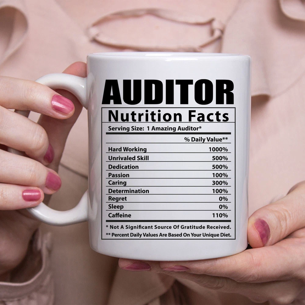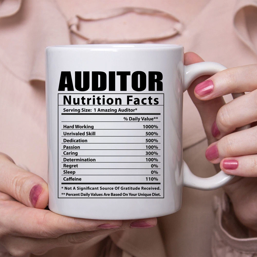 Funny Auditor Nutritional Facts White Mug Product Details.. This high quality 11oz. ceramic white mug has a premium hard coat that provides crisp and vibrant color reproduction sure to last for years. Perfect for all hot & cold beverages. The highest quality printing possible is used. It will never fade no matter how many times you wash it. Material: 100% Ceramic. Print both sides. Dishwasher and Microwave Safe. High Gloss + Premium White Finish. Printed in the U.S.A. Personalized & Custom. We support personalized and custom mug to add custom, when placing an order, you can add notes to the "order note" in shipping address section. Also you can contact us directly via message. Shipping Info. Ready to ship in 1 to 2 business days, All products are made-to-order and proudly printed in the United States. Shipped by USPS and DHL, You will receive your order in 5-7 days. Replace & Refund. All products are defective during shipping broken, chipped will be replaced free of charge. You are not satisfied with the product, we will refund 100% money to you. If any other issues arise, please do not hesitate to message, we would be more than happy to assist you.