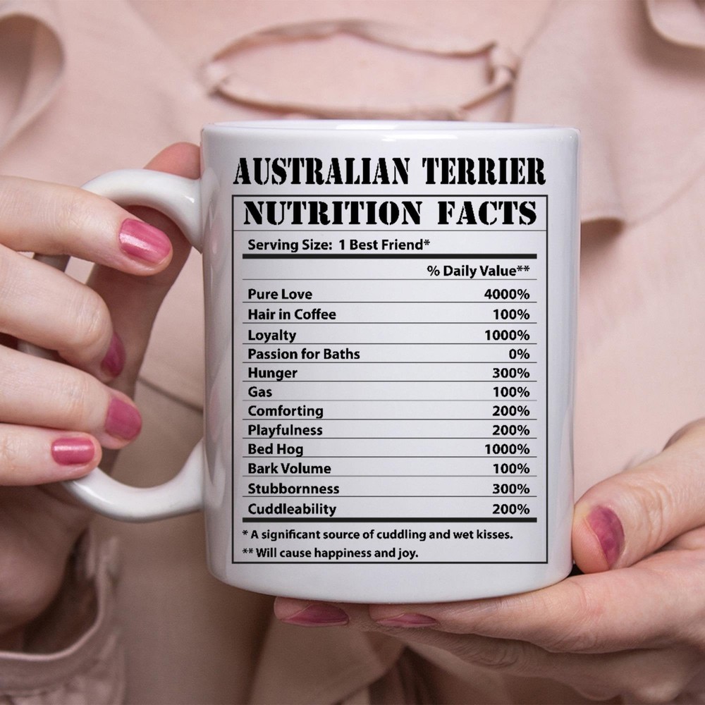 Funny Australian Terrier Gifts Nutritional Facts White Coffee Mug Product Details.. This high quality 11oz. ceramic white mug has a premium hard coat that provides crisp and vibrant color reproduction sure to last for years. Perfect for all hot & cold beverages. The highest quality printing possible is used. It will never fade no matter how many times you wash it. Material: 100% Ceramic. Print both sides. Dishwasher and Microwave Safe. High Gloss + Premium White Finish. Printed in the U.S.A. Personalized & Custom. We support personalized and custom mug to add custom, when placing an order, you can add notes to the "order note" in shipping address section. Also you can contact us directly via message. Shipping Info. Ready to ship in 1 to 2 business days, All products are made-to-order and proudly printed in the United States. Shipped by USPS and DHL, You will receive your order in 5-7 days. Replace & Refund. All products are defective during shipping broken, chipped will be replaced free of charge. You are not satisfied with the product, we will refund 100% money to you. If any other issues arise, please do not hesitate to message, we would be more than happy to assist you.