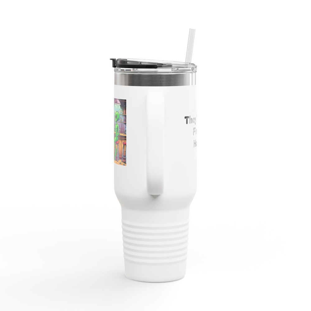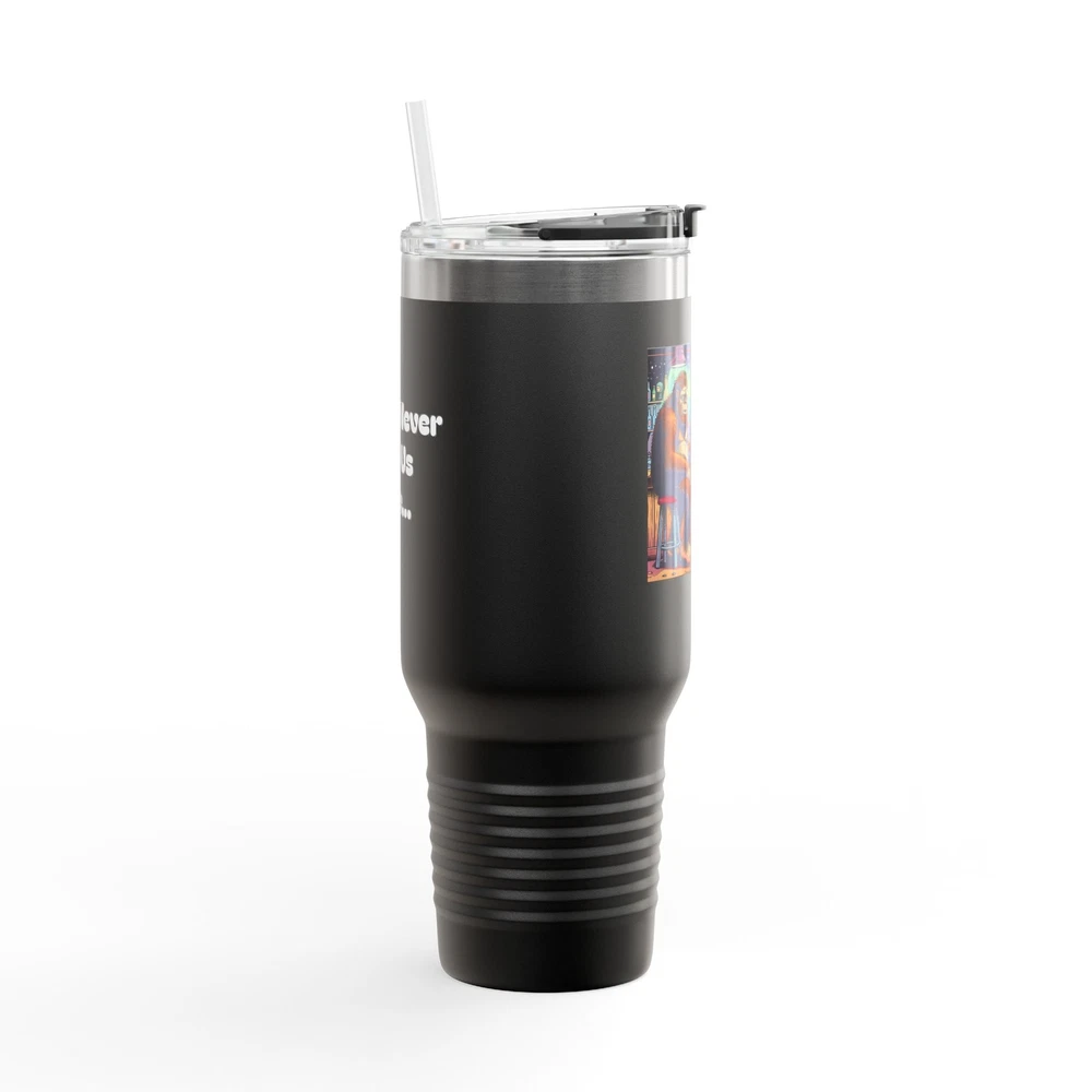 This unique and humorous 40oz insulated travel mug features an original design showcasing Bigfoot and an alien enjoying a drink together at a bar, with the witty caption "They'll Never Find Us Here" printed below. Features: High-Quality Construction: Made from durable stainless steel with a double-wall vacuum insulation to keep your beverages hot or cold for hours. Large Capacity: 40oz capacity is perfect for long trips, work, or outdoor adventures. Leak-Proof Design: Securely fitting lid with a flip-top opening for easy drinking. Eye-Catching Design: Unique and humorous artwork that's sure to be a conversation starter. Perfect Gift: A fun and practical gift for any fan of Bigfoot, aliens, or quirky humor.