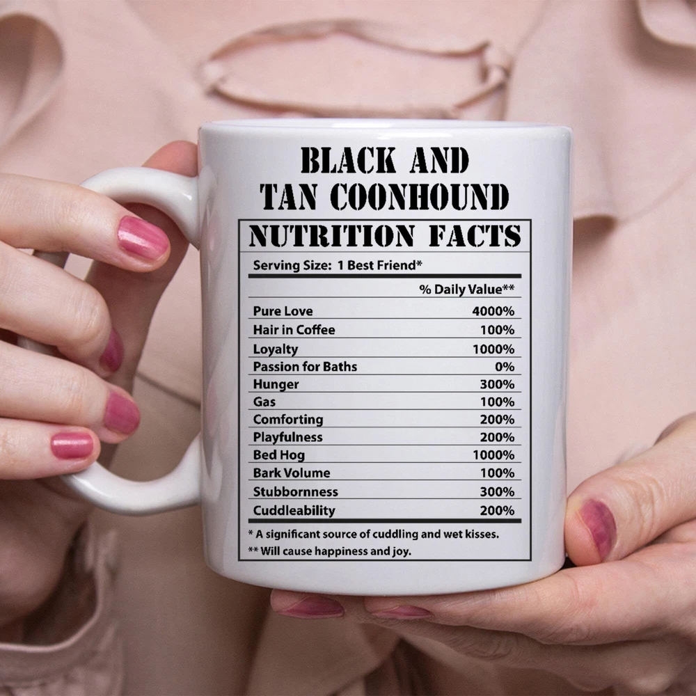 Funny Black And Tan Coonhound Gifts Nutritional Facts White Coffee Mug Product Details.. This high quality 11oz. ceramic white mug has a premium hard coat that provides crisp and vibrant color reproduction sure to last for years. Perfect for all hot & cold beverages. The highest quality printing possible is used. It will never fade no matter how many times you wash it. Material: 100% Ceramic. Print both sides. Dishwasher and Microwave Safe. High Gloss + Premium White Finish. Printed in the U.S.A. Personalized & Custom. We support personalized and custom mug to add custom, when placing an order, you can add notes to the "order note" in shipping address section. Also you can contact us directly via message. Shipping Info. Ready to ship in 1 to 2 business days, All products are made-to-order and proudly printed in the United States. Shipped by USPS and DHL, You will receive your order in 5-7 days. Replace & Refund. All products are defective during shipping broken, chipped will be replaced free of charge. You are not satisfied with the product, we will refund 100% money to you. If any other issues arise, please do not hesitate to message, we would be more than happy to assist you.