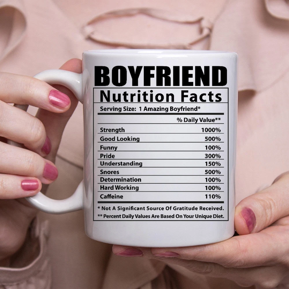 Funny Boyfriend Gifts Nutritional Facts White Coffee Mug Product Details.. This high quality 11oz. ceramic white mug has a premium hard coat that provides crisp and vibrant color reproduction sure to last for years. Perfect for all hot & cold beverages. The highest quality printing possible is used. It will never fade no matter how many times you wash it. Material: 100% Ceramic. Print both sides. Dishwasher and Microwave Safe. High Gloss + Premium White Finish. Printed in the U.S.A. Personalized & Custom. We support personalized and custom mug to add custom, when placing an order, you can add notes to the "order note" in shipping address section. Also you can contact us directly via message. Shipping Info. Ready to ship in 1 to 2 business days, All products are made-to-order and proudly printed in the United States. Shipped by USPS and DHL, You will receive your order in 5-7 days. Replace & Refund. All products are defective during shipping broken, chipped will be replaced free of charge. You are not satisfied with the product, we will refund 100% money to you. If any other issues arise, please do not hesitate to message, we would be more than happy to assist you.