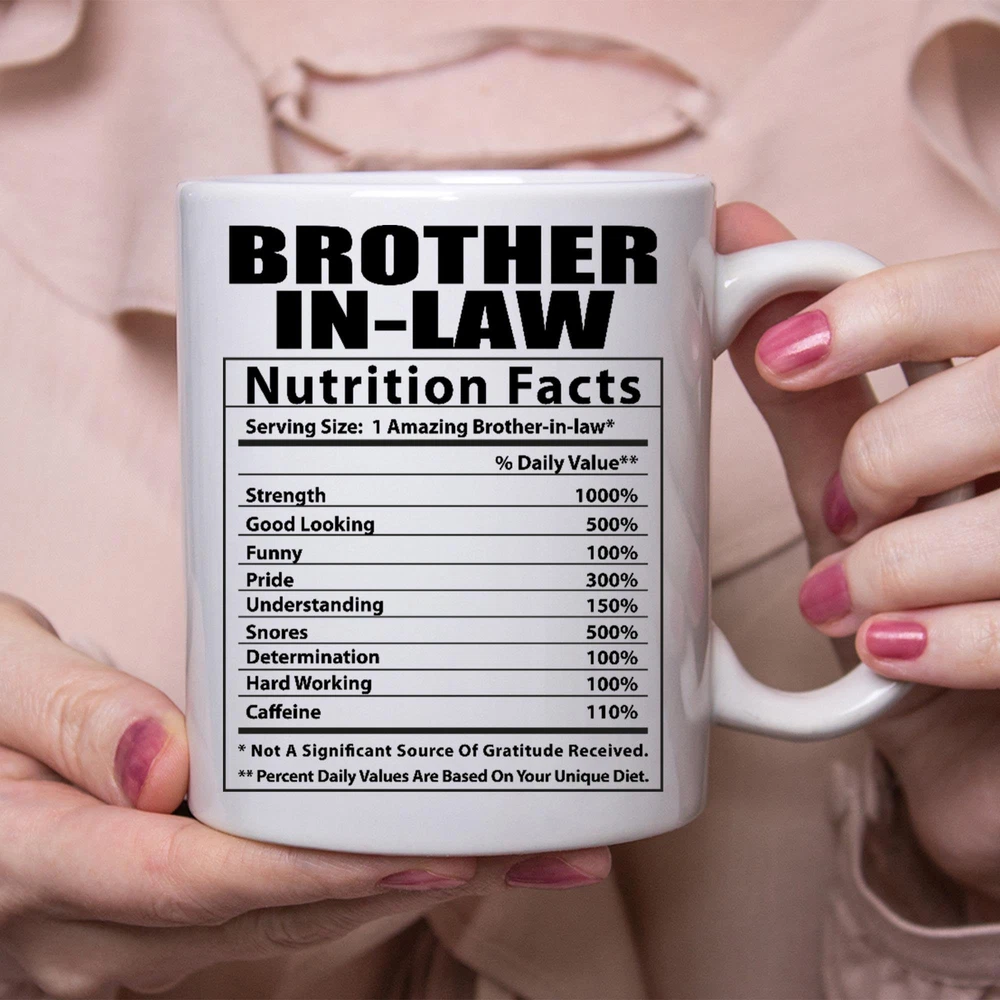 Funny Brother In Law Gifts Nutritional Facts White Coffee Mug Product Details.. This high quality 11oz. ceramic white mug has a premium hard coat that provides crisp and vibrant color reproduction sure to last for years. Perfect for all hot & cold beverages. The highest quality printing possible is used. It will never fade no matter how many times you wash it. Material: 100% Ceramic. Print both sides. Dishwasher and Microwave Safe. High Gloss + Premium White Finish. Printed in the U.S.A. Personalized & Custom. We support personalized and custom mug to add custom, when placing an order, you can add notes to the "order note" in shipping address section. Also you can contact us directly via message. Shipping Info. Ready to ship in 1 to 2 business days, All products are made-to-order and proudly printed in the United States. Shipped by USPS and DHL, You will receive your order in 5-7 days. Replace & Refund. All products are defective during shipping broken, chipped will be replaced free of charge. You are not satisfied with the product, we will refund 100% money to you. If any other issues arise, please do not hesitate to message, we would be more than happy to assist you.