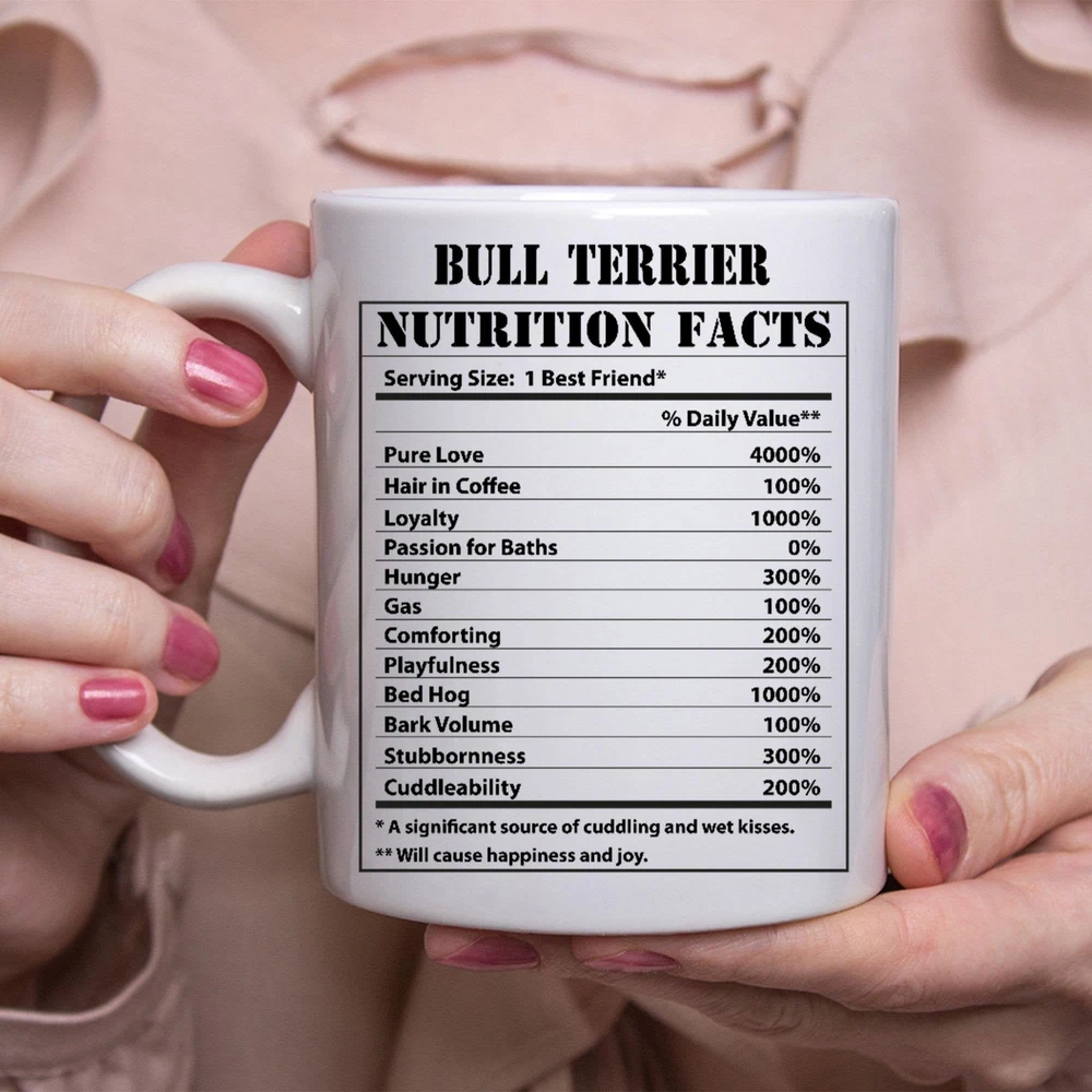 Funny Bull Terrier Gifts Nutritional Facts White Coffee Mug Product Details.. This high quality 11oz. ceramic white mug has a premium hard coat that provides crisp and vibrant color reproduction sure to last for years. Perfect for all hot & cold beverages. The highest quality printing possible is used. It will never fade no matter how many times you wash it. Material: 100% Ceramic. Print both sides. Dishwasher and Microwave Safe. High Gloss + Premium White Finish. Printed in the U.S.A. Personalized & Custom. We support personalized and custom mug to add custom, when placing an order, you can add notes to the "order note" in shipping address section. Also you can contact us directly via message. Shipping Info. Ready to ship in 1 to 2 business days, All products are made-to-order and proudly printed in the United States. Shipped by USPS and DHL, You will receive your order in 5-7 days. Replace & Refund. All products are defective during shipping broken, chipped will be replaced free of charge. You are not satisfied with the product, we will refund 100% money to you. If any other issues arise, please do not hesitate to message, we would be more than happy to assist you.