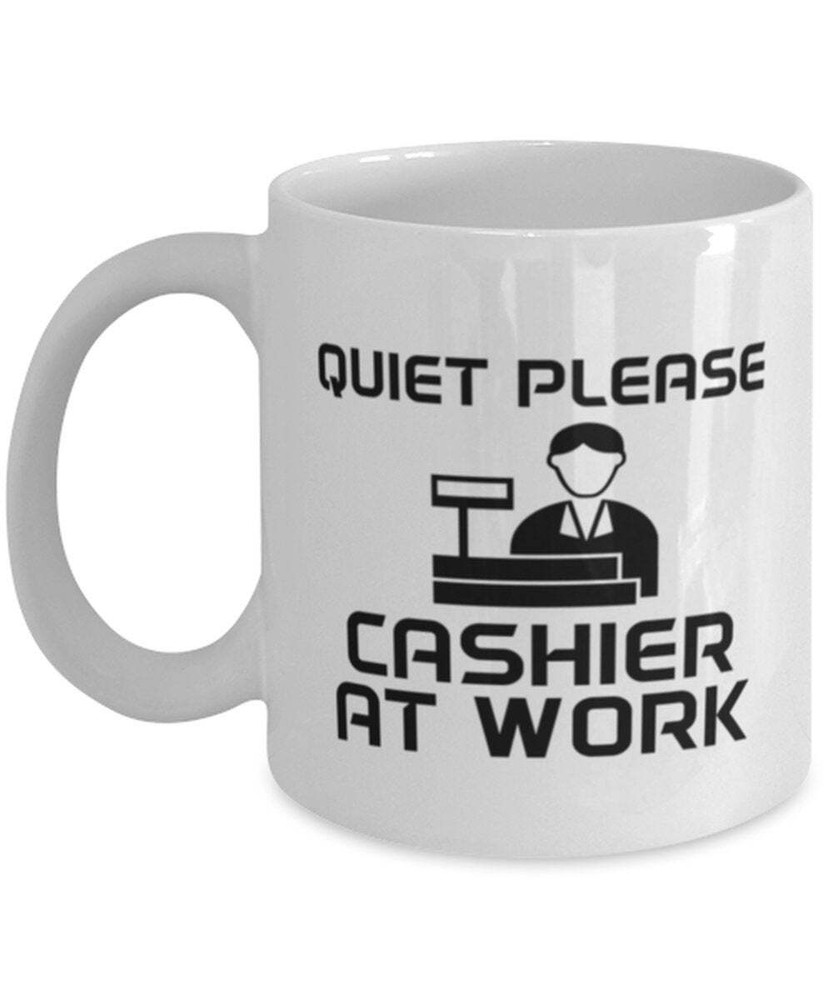 Cashier Funny Coffee Mug Quiet Please Cashier At Work - White Coffee Mug Product Details.. This high quality 11oz. ceramic white mug has a premium hard coat that provides crisp and vibrant color reproduction sure to last for years. Perfect for all hot & cold beverages. The highest quality printing possible is used. It will never fade no matter how many times you wash it. Material: 100% Ceramic. Print both sides. Dishwasher and Microwave Safe. High Gloss + Premium White Finish. Printed in the U.S.A. Personalized & Custom. We support personalized and custom mug to add custom, when placing an order, you can add notes to the "order note" in shipping address section. Also you can contact us directly via message. Shipping Info. Ready to ship in 1 to 2 business days, All products are made-to-order and proudly printed in the United States. Shipped by USPS and DHL, You will receive your order in 5-7 days. Replace & Refund. All products are defective during shipping broken, chipped will be replaced free of charge. You are not satisfied with the product, we will refund 100% money to you. If any other issues arise, please do not hesitate to message, we would be more than happy to assist you.