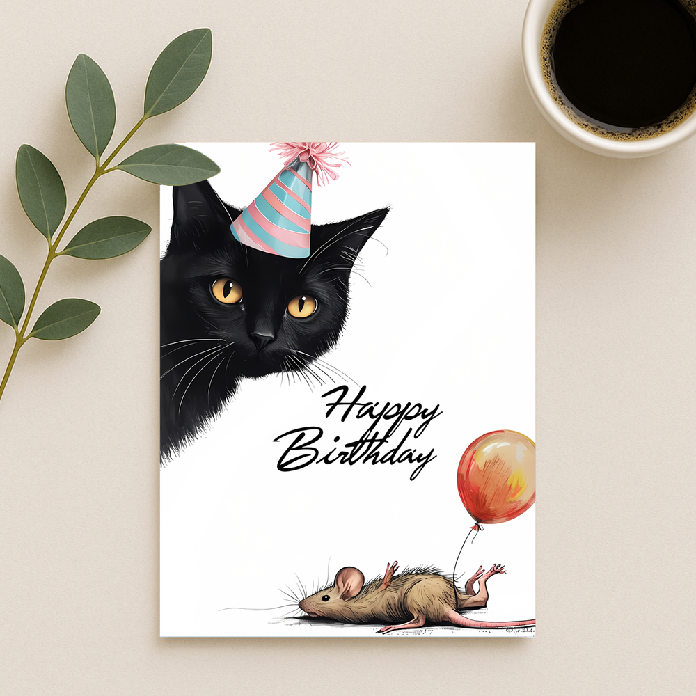 Make them smile with this funny cat-themed birthday card featuring a cheeky black cat in a party hat and a surprised mouse tied to a balloon. Front Text: “Happy Birthday” with cat & mouse illustration Design: Playful, light-hearted cartoon-style art – perfect for animal lovers Size: A5 (approx. 148 x 210 mm) Inside: Blank for your own personal message Envelope: Includes plain white envelope Condition: Brand new, unused Packaging: Sent in a protective sleeve and board-backed “Do Not Bend” envelope A great choice for friends, family, or colleagues who love cats and enjoy a bit of humour on their birthday.