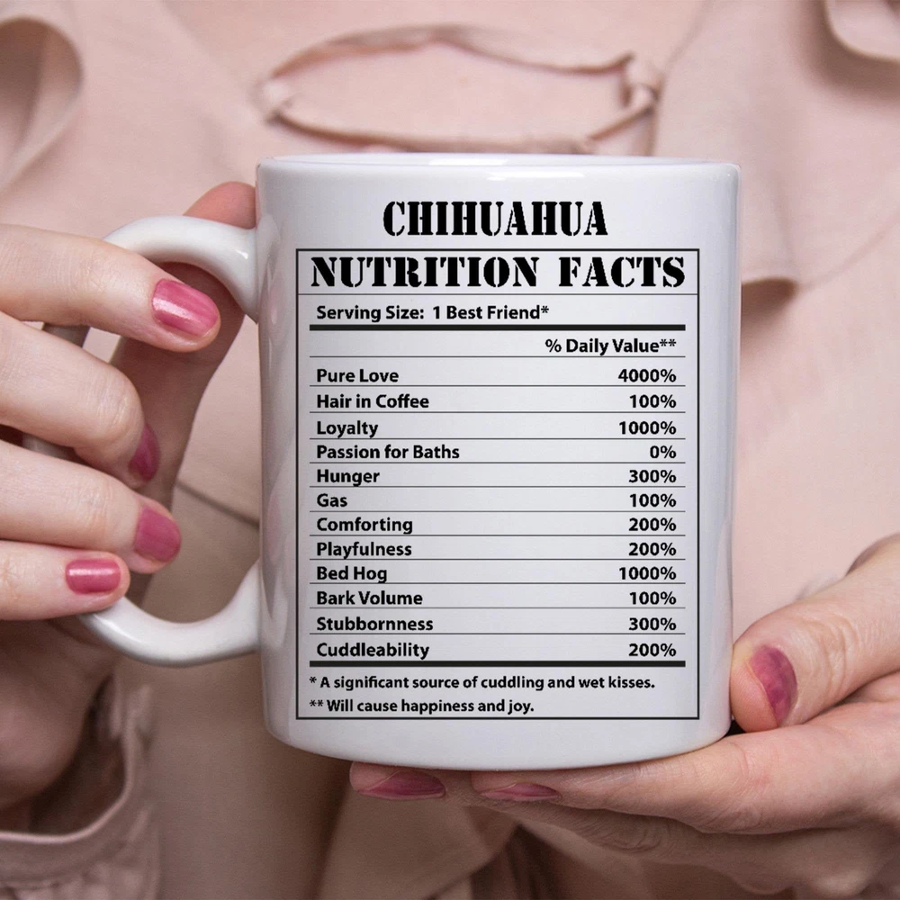 Funny Chihuahua Gifts Nutritional Facts White Coffee Mug Product Details.. This high quality 11oz. ceramic white mug has a premium hard coat that provides crisp and vibrant color reproduction sure to last for years. Perfect for all hot & cold beverages. The highest quality printing possible is used. It will never fade no matter how many times you wash it. Material: 100% Ceramic. Print both sides. Dishwasher and Microwave Safe. High Gloss + Premium White Finish. Printed in the U.S.A. Personalized & Custom. We support personalized and custom mug to add custom, when placing an order, you can add notes to the "order note" in shipping address section. Also you can contact us directly via message. Shipping Info. Ready to ship in 1 to 2 business days, All products are made-to-order and proudly printed in the United States. Shipped by USPS and DHL, You will receive your order in 5-7 days. Replace & Refund. All products are defective during shipping broken, chipped will be replaced free of charge. You are not satisfied with the product, we will refund 100% money to you. If any other issues arise, please do not hesitate to message, we would be more than happy to assist you.