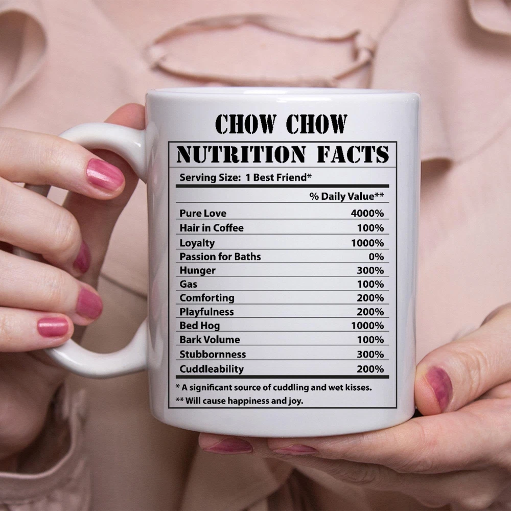 Funny Chow Chow Gifts Nutritional Facts White Coffee Mug Product Details.. This high quality 11oz. ceramic white mug has a premium hard coat that provides crisp and vibrant color reproduction sure to last for years. Perfect for all hot & cold beverages. The highest quality printing possible is used. It will never fade no matter how many times you wash it. Material: 100% Ceramic. Print both sides. Dishwasher and Microwave Safe. High Gloss + Premium White Finish. Printed in the U.S.A. Personalized & Custom. We support personalized and custom mug to add custom, when placing an order, you can add notes to the "order note" in shipping address section. Also you can contact us directly via message. Shipping Info. Ready to ship in 1 to 2 business days, All products are made-to-order and proudly printed in the United States. Shipped by USPS and DHL, You will receive your order in 5-7 days. Replace & Refund. All products are defective during shipping broken, chipped will be replaced free of charge. You are not satisfied with the product, we will refund 100% money to you. If any other issues arise, please do not hesitate to message, we would be more than happy to assist you.