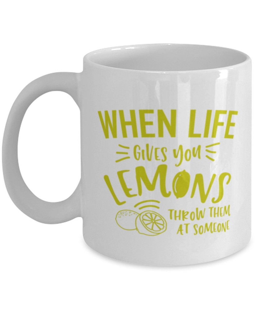 Funny Saying Coffee Mug When Life Gives You Lemons Throw Them At Someone Mug Product Details.. This high quality 11oz. ceramic white mug has a premium hard coat that provides crisp and vibrant color reproduction sure to last for years. Perfect for all hot & cold beverages. The highest quality printing possible is used. It will never fade no matter how many times you wash it. Material: 100% Ceramic. Print both sides. Dishwasher and Microwave Safe. High Gloss + Premium White Finish. Printed in the U.S.A. Personalized & Custom. We support personalized and custom mug to add custom, when placing an order, you can add notes to the "order note" in shipping address section. Also you can contact us directly via message. Shipping Info. Ready to ship in 1 to 2 business days, All products are made-to-order and proudly printed in the United States. Shipped by USPS and DHL, You will receive your order in 5-7 days. Replace & Refund. All products are defective during shipping broken, chipped will be replaced free of charge. You are not satisfied with the product, we will refund 100% money to you. If any other issues arise, please do not hesitate to message, we would be more than happy to assist you.