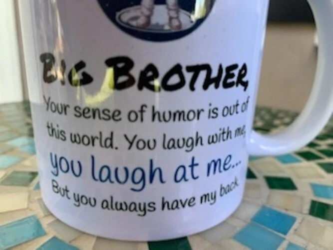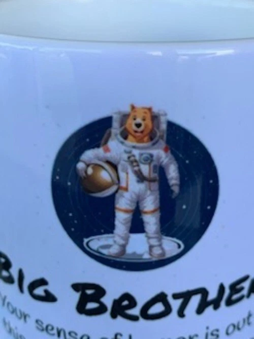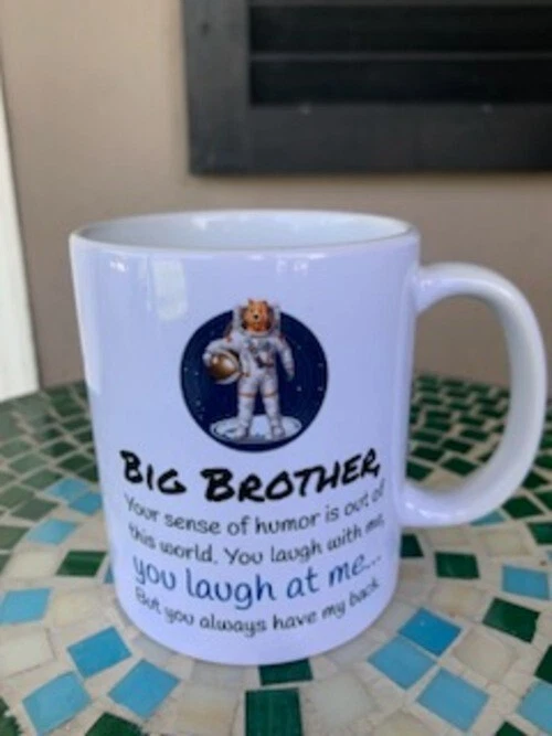 This coffee mug is the perfect gift for your big brother on any occasion, whether it's Christmas, Father's Day, Siblings Day, or his birthday. The tongue-in-cheek message will for sure bring a smile to his face. Get this coffee mug for your big bro today and let him know how much he means to you! NOTE: The original design showed faint, tiny stars all around the space bear image around the outside of the circle. It is very faint, almost imperceptible. I tried to magnify an image so to make it clear. The never-used mug comes in an open box. Dishwasher and microwave safe. A comfortable handle designed to fit 3 average adult fingers. Rounded edges for comfort.