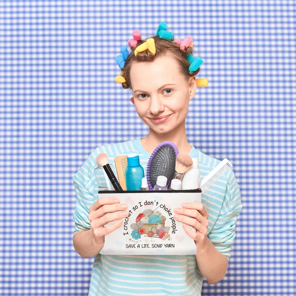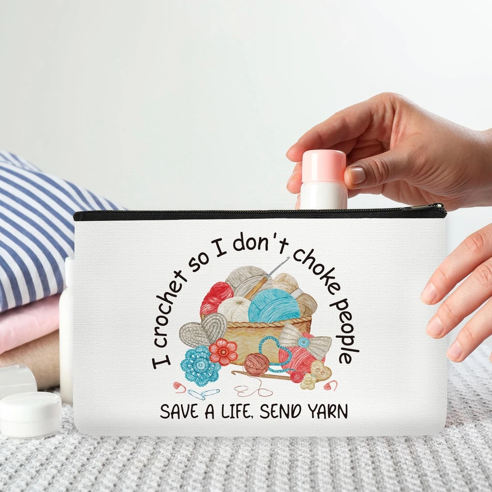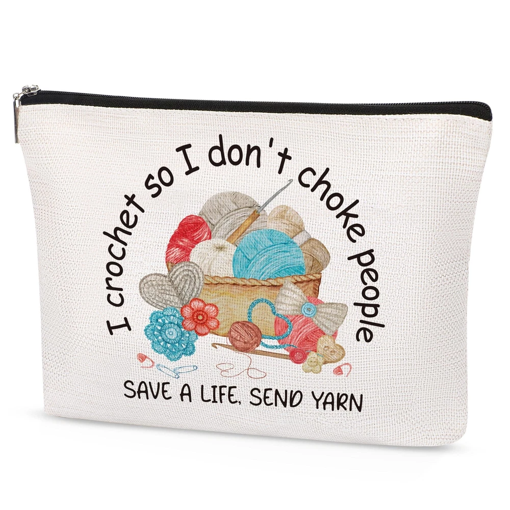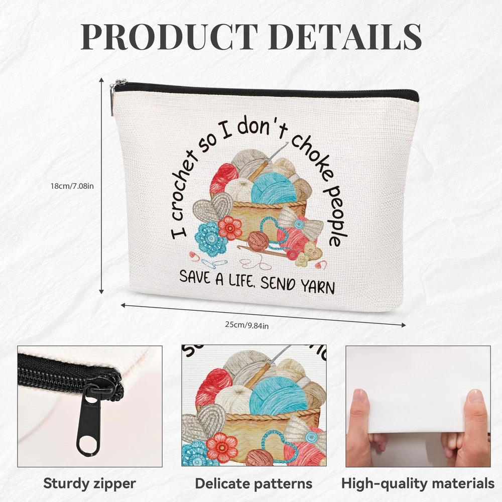 Funny Crocheting Gifts Makeup Bag for Women Knitting Gift for Crochet Beginner Crochet Lovers Friends Crocheters Accessories Cosmetic Bag Product Details Product Dimensions: 9.8 x 7 x 0.1 inches Item Weight: 1.06 ounces Department: Unisex Adult Manufacturer: SEAOYOZO Country of Origin: China Crocheters Accessories: Our crocheting gifts makeup bag is perfect for crocheters who love their craft, featuring inspiring phrases such as "I Crochet So I Don't Choke" and "Save A Life Send Yarn" printed on it. Great Gift: Ideal for birthdays, travel, weddings, housewarmings, Halloween, Christmas, New Year, and as a thoughtful gift for your best friend, mom, sister, aunt, teacher, wife, grandma, daughter, cousin, boss, employee, nurse, lawyer, doctor, colleague, or anyone special. Large Capacity, Multipurpose: Sized at 9.7 x 7 inches, it can hold various items such as makeup brushes, lipstick, mobile phones, toiletries, keys, yarn, etc. Use it as a cosmetic travel bag, makeup bag, makeup brush bag, travel bag, storage bag, portable toiletries bag, or wallet. High-Quality Material: Crafted from linen, it is scratch-resistant and waterproof. A sturdy zipper ensures that beauty products are securely stored and easily accessible. Fashion Design: Double-sided printing with beautiful patterns and motivational slogans reflects your personal style. Choose from a variety of inspiring, fun, and cute designs to express yourself. Crocheters Accessories - Our makeup bag is perfect for crochet enthusiasts, featuring inspiring phrases like "I Crochet So I Don't Choke" and "Save A Life Send Yarn".Great Gift - Ideal for various occasions such as birthdays, travel, weddings, and as a thoughtful gift for anyone special in your life.Large Capacity - Sized at 9.7 x 7 inches, it holds various items and can be used as a versatile cosmetic or travel bag, crafted from scratch-resistant, waterproof linen with a sturdy zipper.