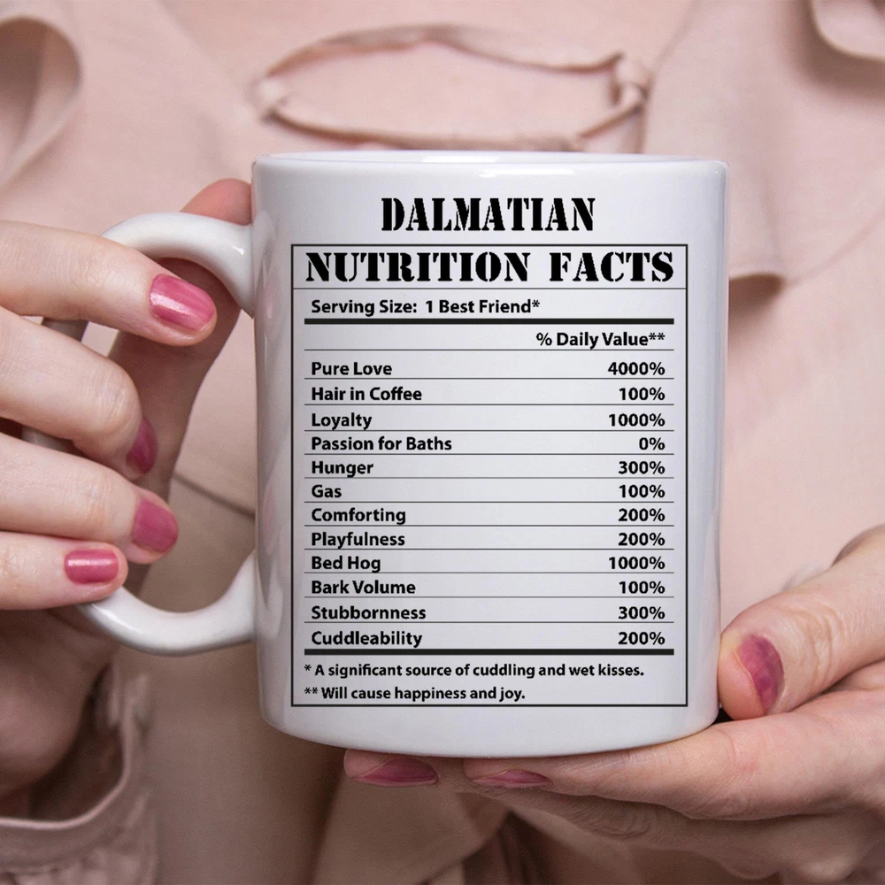 Funny Dalmatian Gifts Nutritional Facts White Coffee Mug Product Details.. This high quality 11oz. ceramic white mug has a premium hard coat that provides crisp and vibrant color reproduction sure to last for years. Perfect for all hot & cold beverages. The highest quality printing possible is used. It will never fade no matter how many times you wash it. Material: 100% Ceramic. Print both sides. Dishwasher and Microwave Safe. High Gloss + Premium White Finish. Printed in the U.S.A. Personalized & Custom. We support personalized and custom mug to add custom, when placing an order, you can add notes to the "order note" in shipping address section. Also you can contact us directly via message. Shipping Info. Ready to ship in 1 to 2 business days, All products are made-to-order and proudly printed in the United States. Shipped by USPS and DHL, You will receive your order in 5-7 days. Replace & Refund. All products are defective during shipping broken, chipped will be replaced free of charge. You are not satisfied with the product, we will refund 100% money to you. If any other issues arise, please do not hesitate to message, we would be more than happy to assist you.