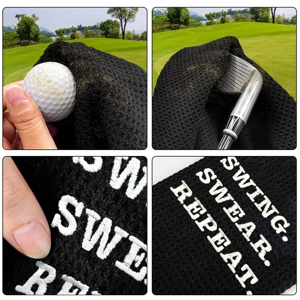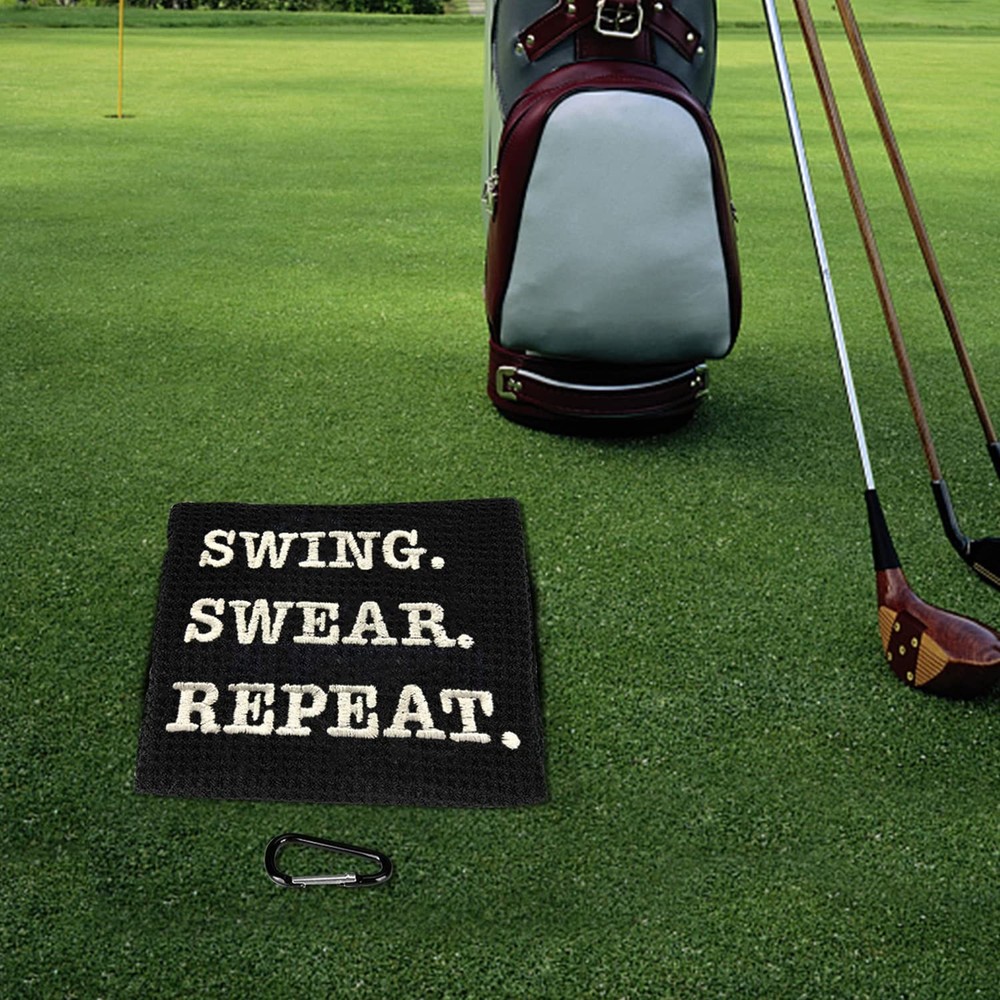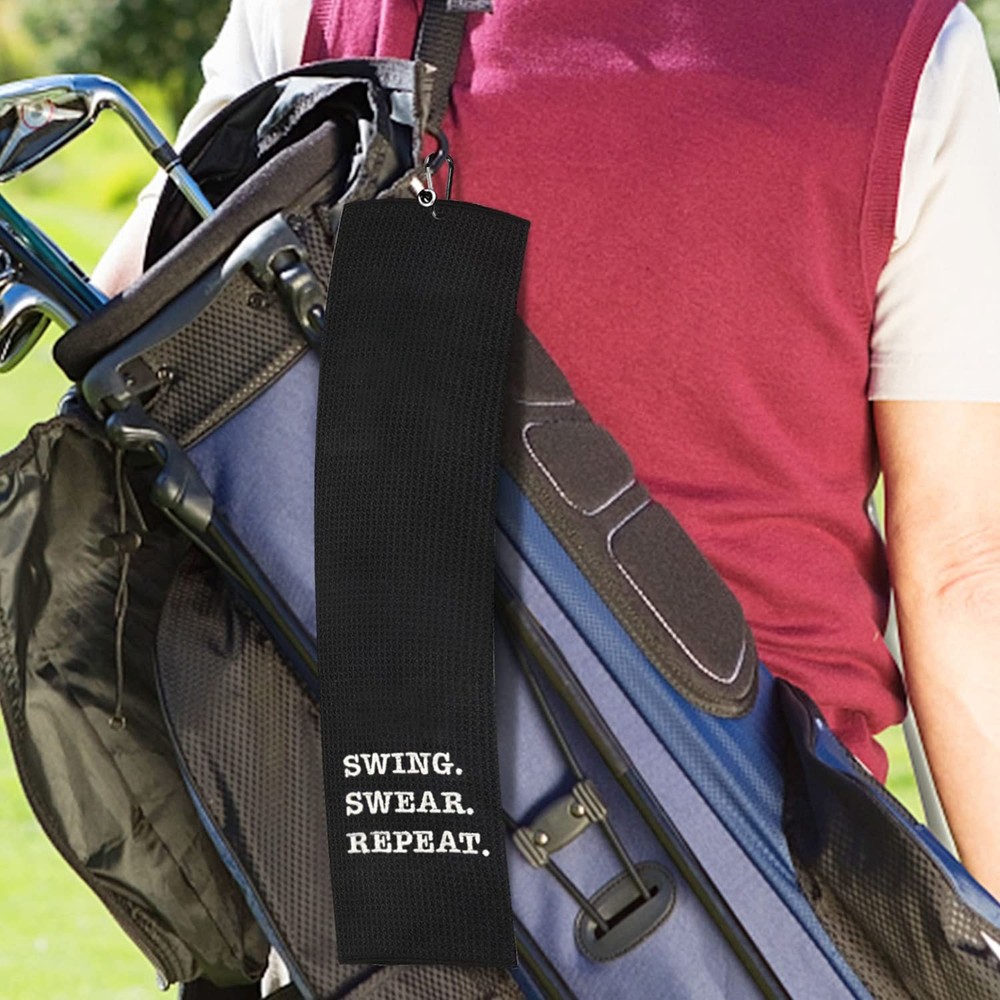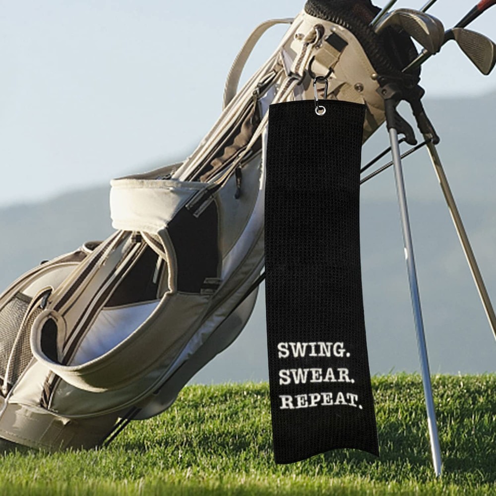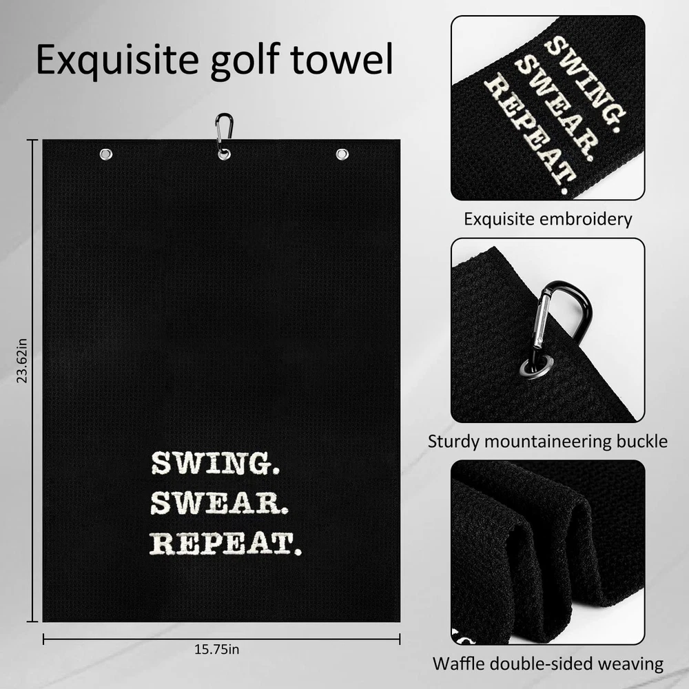 Golf Towel 15.75"×23.62" Folded Microfiber Waffle. Fun Embroidery, with Carabiner Clip for Golf Sports Running Yoga. Standout on the Course with This Personalized Golf Towel. - Specification: Color: black Material: microfiber Size: 40×60cm/15.75"×23.62" - 5 REASONS why you should buy this product: 1, This golf towel is made of microfiber, 100% brand new and high quality. 2, This soft, absorbent microfiber towel is lightweight and quickly drying. 3, Intended for dry or damp use to wipe down all golf equipment. 4, Aluminum clip that conveniently attaches to your golf bag and prevents loose clip and lost towels. 5, Light weight, easy to take, lint free, good handfeeling,delicate edge and dense stitch, durable, antistatic long life quality. - Note: 1, Please allow 0-1cm error due to manual measurement. pls make sure you do not mind before you bid. 2, Due to the difference between different monitors, the picture may not reflect the actual color of the item. 3, Your satisfaction is our priority. Buy with total confidence and enjoy the product. We will make sure you love our golf towels. If you have any questions, please feel free to contact us. 🏌️♂️MATERIAL: Microfiber waffle golf towels remove dirt, grass, sand, and excel at drying your clubs and balls, washable, durable, and more absorbent than cotton, the darker colors as they don’t show the dirt as much. 🏌️♂️SIZE: 15.75 inches * 23.62 inches (Tips: manual measurement tolerance) with a trifold center grommet and a heavy duty carabiner clip, the sturdy carabiner can be easily fixed to your golf bag, saved the space of your golf bag. 🏌️♂️QUALITY: Delicate professional embroidered golf towel " SWING SWEAR REPEAT ". 🏌️♂️FUN GIFTS: This is a fun gift for golf accessories - Birthday gifts - Fathers Day gifts from daughter, Fathers Day gifts for dad, Fathers Day gifts from son, or Fathers Day gifts from wife. 🏌️♂️BUYING CROWD: Great golf gifts for men, women, kids, golf accessories and golf gift.
