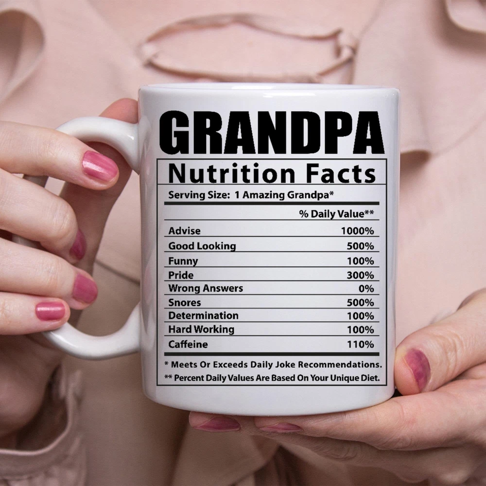 Funny Grandpa Gifts Nutritional Facts White Coffee Mug Product Details.. This high quality 11oz. ceramic white mug has a premium hard coat that provides crisp and vibrant color reproduction sure to last for years. Perfect for all hot & cold beverages. The highest quality printing possible is used. It will never fade no matter how many times you wash it. Material: 100% Ceramic. Print both sides. Dishwasher and Microwave Safe. High Gloss + Premium White Finish. Printed in the U.S.A. Personalized & Custom. We support personalized and custom mug to add custom, when placing an order, you can add notes to the "order note" in shipping address section. Also you can contact us directly via message. Shipping Info. Ready to ship in 1 to 2 business days, All products are made-to-order and proudly printed in the United States. Shipped by USPS and DHL, You will receive your order in 5-7 days. Replace & Refund. All products are defective during shipping broken, chipped will be replaced free of charge. You are not satisfied with the product, we will refund 100% money to you. If any other issues arise, please do not hesitate to message, we would be more than happy to assist you.