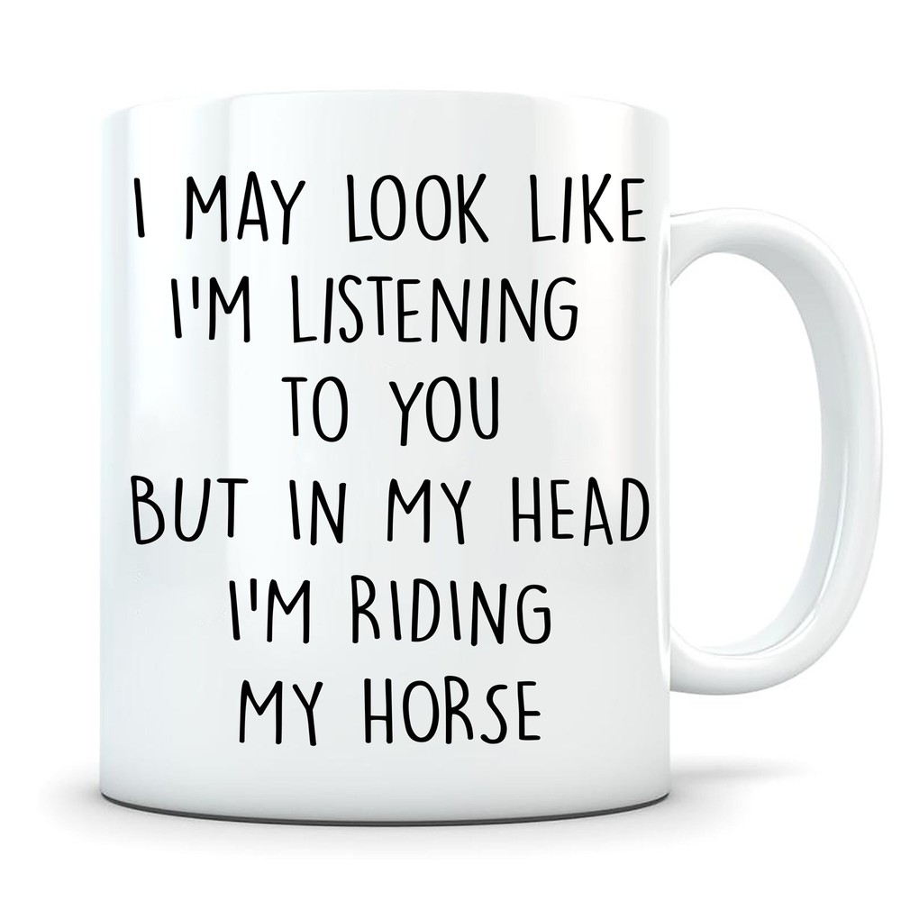 I May Look Like I'm Listening Mug I'm Riding My Horse Mug Horse Riding Gift Mug Product Details.. This high quality 11oz. ceramic white mug has a premium hard coat that provides crisp and vibrant color reproduction sure to last for years. Perfect for all hot & cold beverages. The highest quality printing possible is used. It will never fade no matter how many times you wash it. Material: 100% Ceramic. Print both sides. Dishwasher and Microwave Safe. High Gloss + Premium White Finish. Printed in the U.S.A. Personalized & Custom. We support personalized and custom mug to add custom, when placing an order, you can add notes to the "order note" in shipping address section. Also you can contact us directly via message. Shipping Info. Ready to ship in 1 to 2 business days, All products are made-to-order and proudly printed in the United States. Shipped by USPS and DHL, You will receive your order in 5-7 days. Replace & Refund. All products are defective during shipping broken, chipped will be replaced free of charge. You are not satisfied with the product, we will refund 100% money to you. If any other issues arise, please do not hesitate to message, we would be more than happy to assist you.