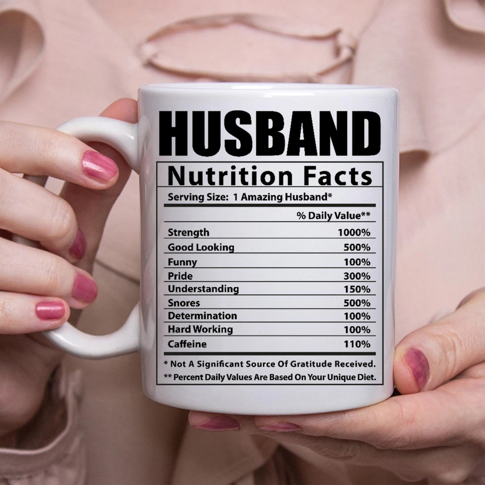 Funny Husband Gifts Nutritional Facts White Coffee Mug Product Details.. This high quality 11oz. ceramic white mug has a premium hard coat that provides crisp and vibrant color reproduction sure to last for years. Perfect for all hot & cold beverages. The highest quality printing possible is used. It will never fade no matter how many times you wash it. Material: 100% Ceramic. Print both sides. Dishwasher and Microwave Safe. High Gloss + Premium White Finish. Printed in the U.S.A. Personalized & Custom. We support personalized and custom mug to add custom, when placing an order, you can add notes to the "order note" in shipping address section. Also you can contact us directly via message. Shipping Info. Ready to ship in 1 to 2 business days, All products are made-to-order and proudly printed in the United States. Shipped by USPS and DHL, You will receive your order in 5-7 days. Replace & Refund. All products are defective during shipping broken, chipped will be replaced free of charge. You are not satisfied with the product, we will refund 100% money to you. If any other issues arise, please do not hesitate to message, we would be more than happy to assist you.