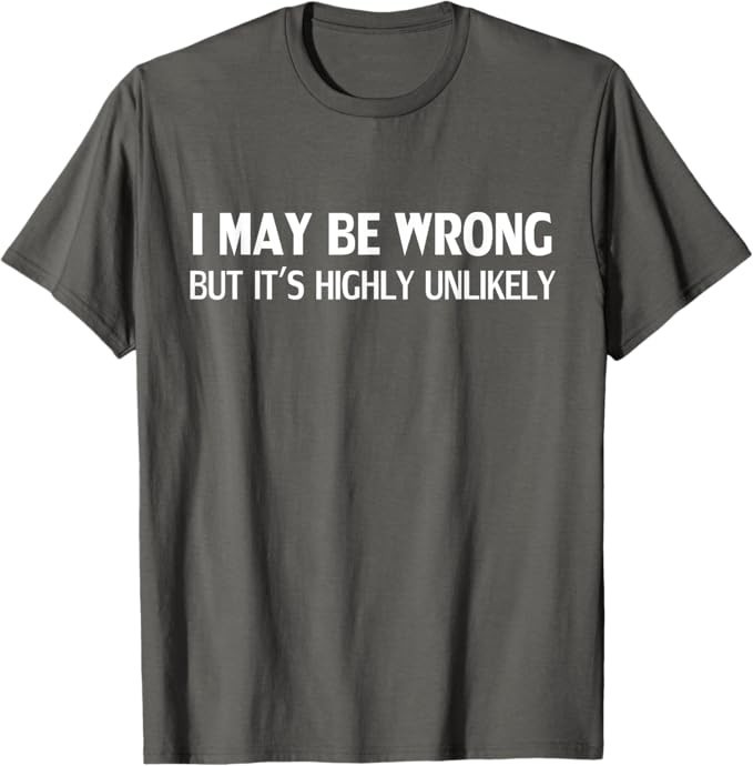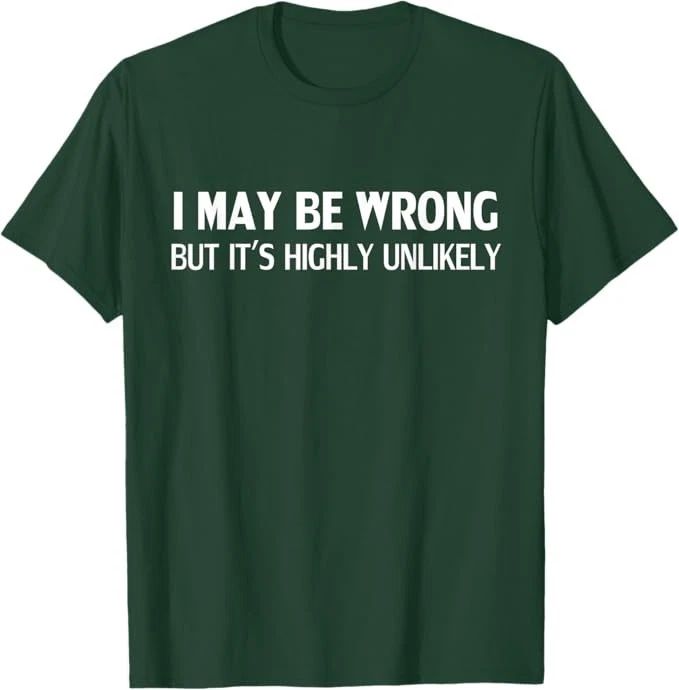 Funny I May Be Wrong But It's Highly Unlikely T-Shirt Designed and Printed in USA Product Features: • Classic Look and Feel: This ultra cotton tee offer the timeless appeal of traditional cotton. The high-quality print enhances its casual appearance. • Material: Made from 6.1-ounce, 100% cotton. (Note: Dark Heather variant is 50% cotton, 50% polyester.) • Durability: Features double-needle stitching on the neck, sleeves, and hem for added durability. Designed for a roomy, unisex fit. • Print Type: DTG (Direct to Garment) • Manufacturer: Gildan 5000, 5000b (Made in USA) Shipping Information: • Handling Time: With POD(Print-On-Demand) product model, we typically require about 3 business-days handling time before shipping. In most cases, our handling time’s , rang e from 1-2 business days. • Delivery Time: • USA: Approximately 2 -6 business days • Canada: Approximately 6-10 business days (We currently don’t offer international Shipping) • Worldwide: Approximately 15-25 business days (We Currently don’t offer international Shipping) • Shipping Carriers: USPS and DHL • Note: Business days exclude weekends and holidays. Return & Exchange Policy: • Quality Guarantee: We stand behind the quality of our products and workmanship . Any defects or errors on our part must result in a refund/ replacement at no charge. • Conditions for Returns: Returns are generally not accepted for user errors such as incorrect selection of sizes, designs, or colors. Returns /Replacements are acceptable for damages such as poor printing results, incorrect size or design caused by us. • Note: Please reach out to us if there are any questions or issue s with your item, we’ll do our best to resolve any issue you might have. Note: • We’re glad to have your support! If you have a moment, y our honest feedback is very valuable to us. Thank you!