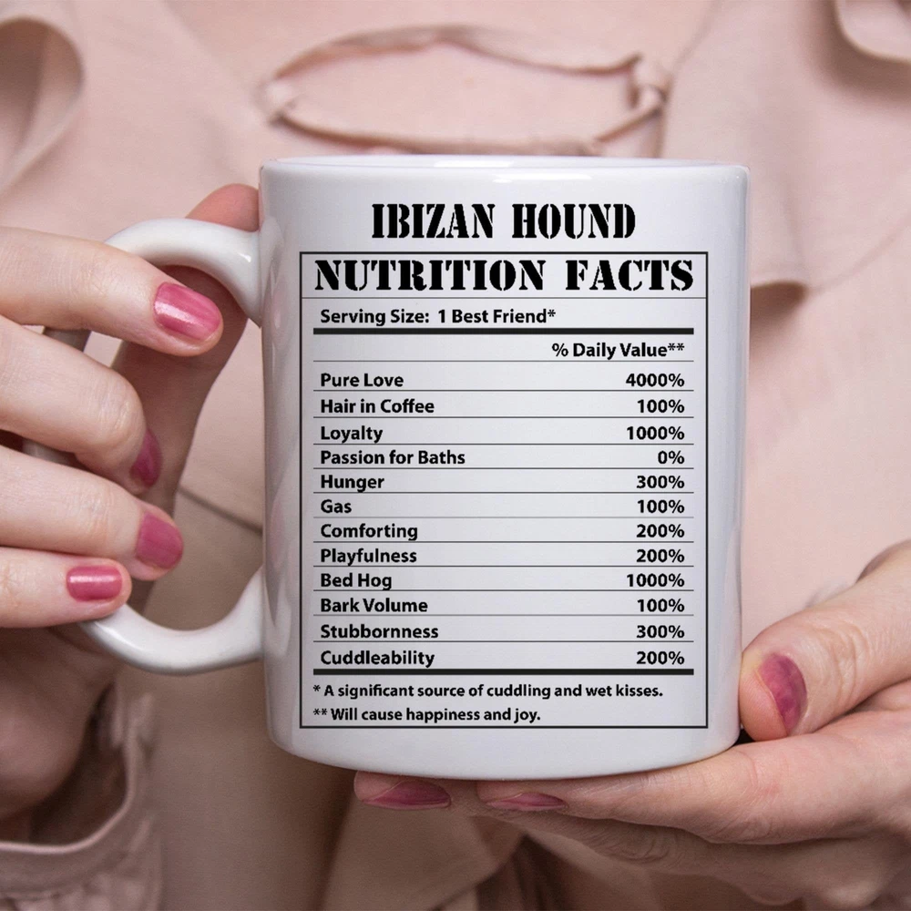 Funny Ibizan Hound Gifts Nutritional Facts White Coffee Mug Product Details.. This high quality 11oz. ceramic white mug has a premium hard coat that provides crisp and vibrant color reproduction sure to last for years. Perfect for all hot & cold beverages. The highest quality printing possible is used. It will never fade no matter how many times you wash it. Material: 100% Ceramic. Print both sides. Dishwasher and Microwave Safe. High Gloss + Premium White Finish. Printed in the U.S.A. Personalized & Custom. We support personalized and custom mug to add custom, when placing an order, you can add notes to the "order note" in shipping address section. Also you can contact us directly via message. Shipping Info. Ready to ship in 1 to 2 business days, All products are made-to-order and proudly printed in the United States. Shipped by USPS and DHL, You will receive your order in 5-7 days. Replace & Refund. All products are defective during shipping broken, chipped will be replaced free of charge. You are not satisfied with the product, we will refund 100% money to you. If any other issues arise, please do not hesitate to message, we would be more than happy to assist you.
