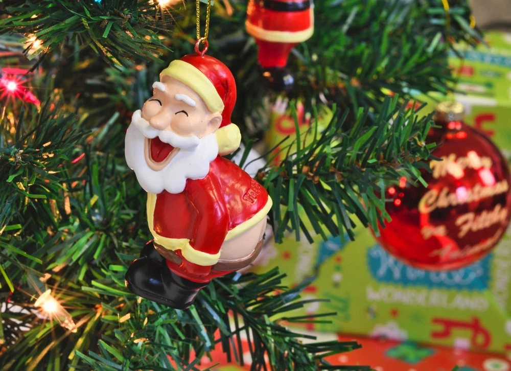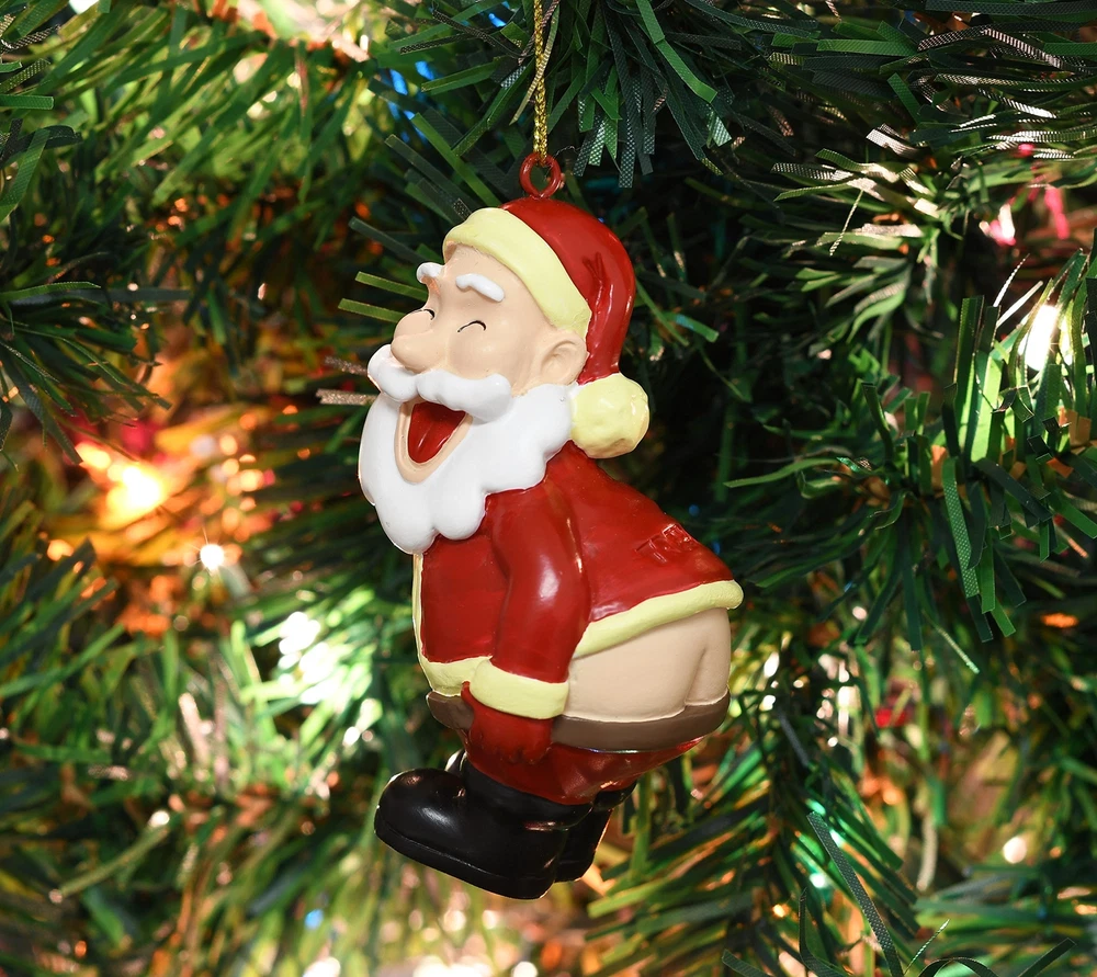Santa Claus Christmas Ornament - Making Non-traditional Ornaments, a Tradition Size - This Funny Santa Claus Ornament Stands 3.5 Inches - The perfect size for any Christmas Tree. Material - Top Quality Resin adds to the weight but also adds to the ornaments durability. It will take a lot more than just falling off the Christmas Tree to brake this Ornament Theme - In this funny santa claus ornament, Santa is mooning with his pants down and a smile on his face. This ornament will sure get a laugh on your tree, at the families white elephant gift exchange or as a Christmas gag gift. offers a small line of Funny / Unique Christmas Products. Ranging from Ornaments to Ugly Sweaters to Christmas socks. The Gaming Santa Christmas ornament will make everyone whom looks upon your Christmas Tree smile, year after year. A portion of annual sales gets donated to charity. Help Support Us, Help Us Support Others. Thank you and Happy Holidays! Santa's showing off his butt in this hilarious mooning Santa xmas ornament. Made of hand-painted quality resin. We use resin instead of blown glass to add durability to the ornament. Each ornament is hand painted to make sure every detail and color is applied properly. This funny Santa Claus ornament stands 3.5 inches - The perfect size for any Christmas Tree. The Mooning Santa figure comes new in unopened collectors retail box. , Add some humor to your holidays!