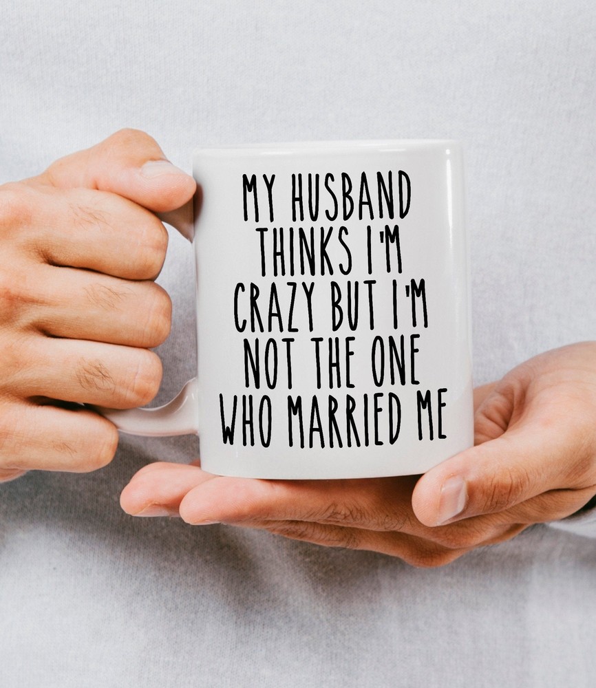 Funny My Husband Thinks I'm Crazy Mug Anniversary Gift Gift For Him Valentines Product Details.. This high quality 11oz. ceramic white mug has a premium hard coat that provides crisp and vibrant color reproduction sure to last for years. Perfect for all hot & cold beverages. The highest quality printing possible is used. It will never fade no matter how many times you wash it. Material: 100% Ceramic. Print both sides. Dishwasher and Microwave Safe. High Gloss + Premium White Finish. Printed in the U.S.A. Personalized & Custom. We support personalized and custom mug to add custom, when placing an order, you can add notes to the "order note" in shipping address section. Also you can contact us directly via message. Shipping Info. Ready to ship in 1 to 2 business days, All products are made-to-order and proudly printed in the United States. Shipped by USPS and DHL, You will receive your order in 5-7 days. Replace & Refund. All products are defective during shipping broken, chipped will be replaced free of charge. You are not satisfied with the product, we will refund 100% money to you. If any other issues arise, please do not hesitate to message, we would be more than happy to assist you.