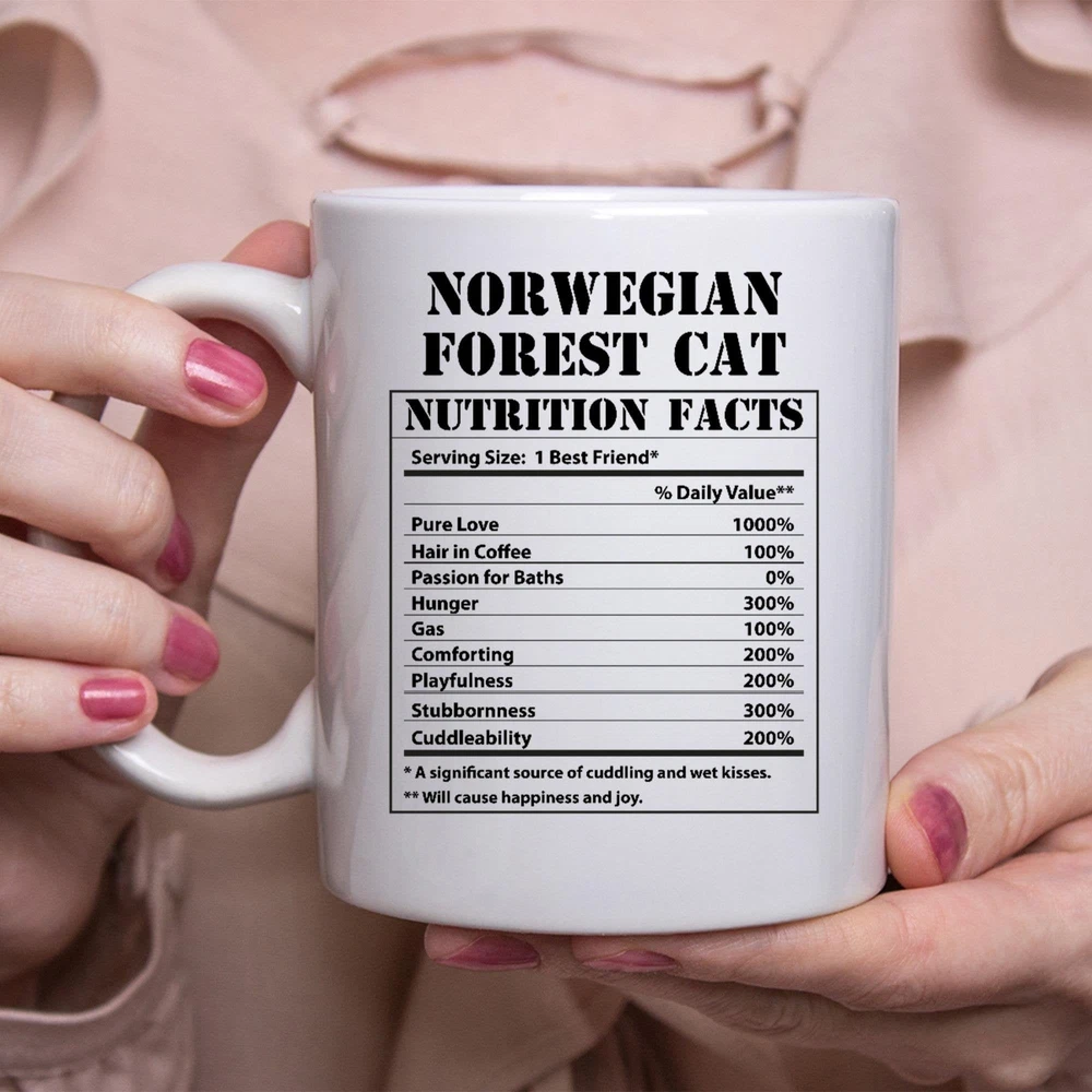 Funny Norwegian Forest Cat Gifts Nutritional Facts White Coffee Mug Product Details.. This high quality 11oz. ceramic white mug has a premium hard coat that provides crisp and vibrant color reproduction sure to last for years. Perfect for all hot & cold beverages. The highest quality printing possible is used. It will never fade no matter how many times you wash it. Material: 100% Ceramic. Print both sides. Dishwasher and Microwave Safe. High Gloss + Premium White Finish. Printed in the U.S.A. Personalized & Custom. We support personalized and custom mug to add custom, when placing an order, you can add notes to the "order note" in shipping address section. Also you can contact us directly via message. Shipping Info. Ready to ship in 1 to 2 business days, All products are made-to-order and proudly printed in the United States. Shipped by USPS and DHL, You will receive your order in 5-7 days. Replace & Refund. All products are defective during shipping broken, chipped will be replaced free of charge. You are not satisfied with the product, we will refund 100% money to you. If any other issues arise, please do not hesitate to message, we would be more than happy to assist you.