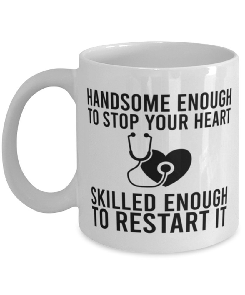 For Him Nurse Funny Graduation Coffee Mug Handsome Enough To Stop Your Heart Mug Product Details.. This high quality 11oz. ceramic white mug has a premium hard coat that provides crisp and vibrant color reproduction sure to last for years. Perfect for all hot & cold beverages. The highest quality printing possible is used. It will never fade no matter how many times you wash it. Material: 100% Ceramic. Print both sides. Dishwasher and Microwave Safe. High Gloss + Premium White Finish. Printed in the U.S.A. Personalized & Custom. We support personalized and custom mug to add custom, when placing an order, you can add notes to the "order note" in shipping address section. Also you can contact us directly via message. Shipping Info. Ready to ship in 1 to 2 business days, All products are made-to-order and proudly printed in the United States. Shipped by USPS and DHL, You will receive your order in 5-7 days. Replace & Refund. All products are defective during shipping broken, chipped will be replaced free of charge. You are not satisfied with the product, we will refund 100% money to you. If any other issues arise, please do not hesitate to message, we would be more than happy to assist you.