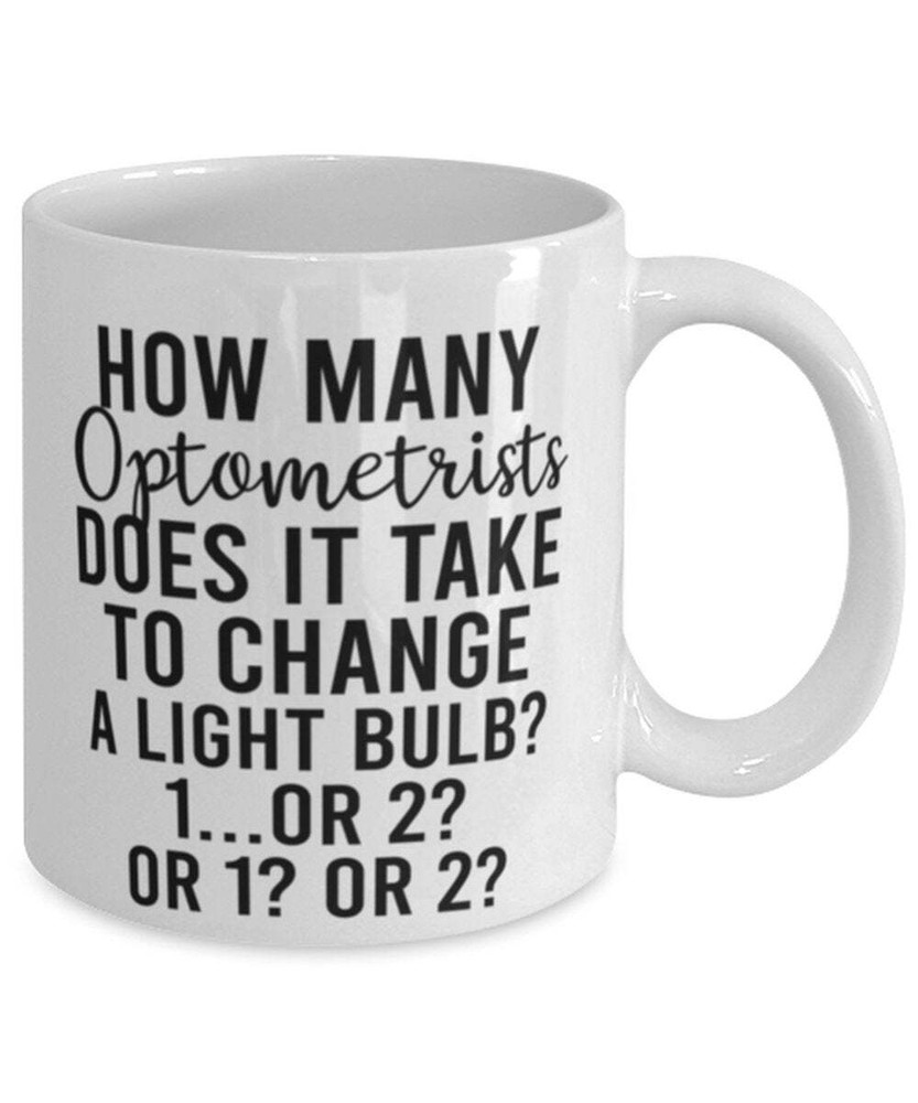 Optometrist Graduation Funny Coffee Mug How Many Optometrist Does It Take To Product Details.. This high quality 11oz. ceramic white mug has a premium hard coat that provides crisp and vibrant color reproduction sure to last for years. Perfect for all hot & cold beverages. The highest quality printing possible is used. It will never fade no matter how many times you wash it. Material: 100% Ceramic. Print both sides. Dishwasher and Microwave Safe. High Gloss + Premium White Finish. Printed in the U.S.A. Personalized & Custom. We support personalized and custom mug to add custom, when placing an order, you can add notes to the "order note" in shipping address section. Also you can contact us directly via message. Shipping Info. Ready to ship in 1 to 2 business days, All products are made-to-order and proudly printed in the United States. Shipped by USPS and DHL, You will receive your order in 5-7 days. Replace & Refund. All products are defective during shipping broken, chipped will be replaced free of charge. You are not satisfied with the product, we will refund 100% money to you. If any other issues arise, please do not hesitate to message, we would be more than happy to assist you.