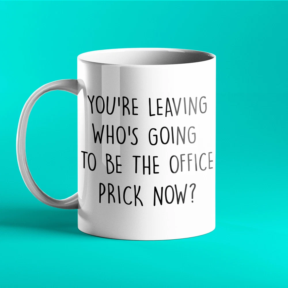 Funny Personalised Mug You're Leaving Who's Going To Be The Office Prick Now Product Details.. This high quality 11oz. ceramic white mug has a premium hard coat that provides crisp and vibrant color reproduction sure to last for years. Perfect for all hot & cold beverages. The highest quality printing possible is used. It will never fade no matter how many times you wash it. Material: 100% Ceramic. Print both sides. Dishwasher and Microwave Safe. High Gloss + Premium White Finish. Printed in the U.S.A. Personalized & Custom. We support personalized and custom mug to add custom, when placing an order, you can add notes to the "order note" in shipping address section. Also you can contact us directly via message. Shipping Info. Ready to ship in 1 to 2 business days, All products are made-to-order and proudly printed in the United States. Shipped by USPS and DHL, You will receive your order in 5-7 days. Replace & Refund. All products are defective during shipping broken, chipped will be replaced free of charge. You are not satisfied with the product, we will refund 100% money to you. If any other issues arise, please do not hesitate to message, we would be more than happy to assist you.