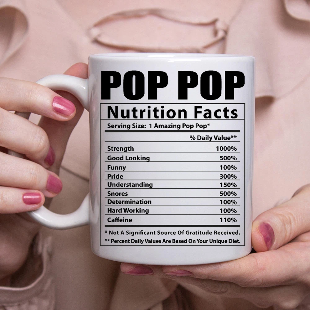 Funny Pop Pop Gifts Nutritional Facts White Coffee Mug Product Details.. This high quality 11oz. ceramic white mug has a premium hard coat that provides crisp and vibrant color reproduction sure to last for years. Perfect for all hot & cold beverages. The highest quality printing possible is used. It will never fade no matter how many times you wash it. Material: 100% Ceramic. Print both sides. Dishwasher and Microwave Safe. High Gloss + Premium White Finish. Printed in the U.S.A. Personalized & Custom. We support personalized and custom mug to add custom, when placing an order, you can add notes to the "order note" in shipping address section. Also you can contact us directly via message. Shipping Info. Ready to ship in 1 to 2 business days, All products are made-to-order and proudly printed in the United States. Shipped by USPS and DHL, You will receive your order in 5-7 days. Replace & Refund. All products are defective during shipping broken, chipped will be replaced free of charge. You are not satisfied with the product, we will refund 100% money to you. If any other issues arise, please do not hesitate to message, we would be more than happy to assist you.