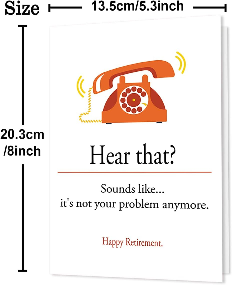 Menu Other Items Feedbacks About Us Contact Us Add To Favorites Funny Retirement Gifts for Women Men, Humor Retirement Leaving Card for Him Her Retired Friends Boss Teachers Nurses Dad Mom Say goodbye to years of hard work and commuting to work with our farewell retirement card. Thank a retiring employee for all the years of service and dedication. Show them how much they mean to you with this special card. Celebrate a retiree with this awesome, retirement congratulations card. Congratulate a coworker, boss, friend, mom, dad, or any special person with this retirement card. CARD SIZE (Folded) : The card size is 8 x 5.3inches / 20.5 x 13.5cm. GOOD QUALITY : This greeting card is printed on recycle 300gsm linen cardstock for a luxury feel. Comes with a sturdy envelope for mailing or gifting. BLANK INSIDE : The inside of our card is blank, you can draw or write whatever you want on it to express your ideas. Item Specification Color BX139 Manufacturer Part Number BX-139-BH Item Weight 1.13 ounces Size 8 x 5.3 inches Product Dimensions 8 x 5.3 x 0.1 inches FREE SHIPPING We are always working hard to ensure your package arrives as soon as possible. Please understand that some factors like weather, high postal traffic, and the performance of shipping companies are outside of our control. We offer free shipping to the lower 48 states. We do not accept P.O. Boxes. Please provide a physical address. If you have a problem or question regarding your transaction please contact us immediately. We will work with you to resolve any problem you may have. Thank you