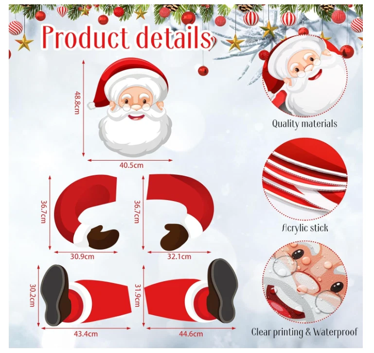 Free eBay listing template designed by dewiso.com Funny Santa Claus Tree Topper & Ornaments for Christmas Decor - Unique Xmas Gift Product Get ready to bring joy and laughter to your holiday season with the Blosssound Funny Santa Claus Tree Topper and Ornament Set! This whimsical decoration features Santa's head, arms, and legs, creating a playful scene as Santa hugs your Christmas tree. Made from durable materials, this adorable set is perfect for adding a unique touch to your holiday decor. It's not just a decoration; it’s a conversation starter that will delight your family and friends! Shipping We take pride in offering fast and reliable delivery for your orders! We are committed to getting your products to you as quickly as possible. Generally, we would like to inform you that all orders will be delivered to you within 1-3 business days after processing. However, in some cases, delivery times may vary depending on the buyer's location. Especially in remote or rural areas, the expected delivery time may be extended. In such situations, we do our best to ensure that your order reaches you as quickly as possible. If there are any delays, we will be happy to contact you to explain the situation. Our goal is to enhance your satisfaction with our fast delivery times. We work diligently to ensure that your order arrives safely. Trust us and enjoy our speedy delivery! Contact For any questions or additional information about the Blosssound Funny Christmas Decorations, please reach out to us. We're here to help you create the perfect holiday atmosphere! Features and Further Details Additional Features : This set includes Santa's head, arms, and legs made of lightweight hollow board, making it easy to place on any Christmas tree without weighing it down. Details : The Santa decoration measures approximately 16.54 inches tall and 11.81 inches wide, making it a standout piece in your holiday decorations. Its vibrant colors and fun design will brighten up your home. Package Includes : One complete Santa Claus decoration set, including all necessary components for easy assembly and display. LuxeFusion