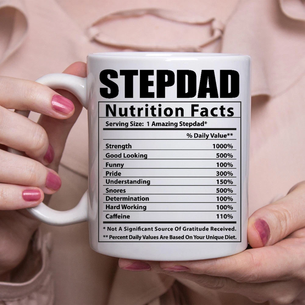 Funny Stepdad Gifts Nutritional Facts White Coffee Mug Product Details.. This high quality 11oz. ceramic white mug has a premium hard coat that provides crisp and vibrant color reproduction sure to last for years. Perfect for all hot & cold beverages. The highest quality printing possible is used. It will never fade no matter how many times you wash it. Material: 100% Ceramic. Print both sides. Dishwasher and Microwave Safe. High Gloss + Premium White Finish. Printed in the U.S.A. Personalized & Custom. We support personalized and custom mug to add custom, when placing an order, you can add notes to the "order note" in shipping address section. Also you can contact us directly via message. Shipping Info. Ready to ship in 1 to 2 business days, All products are made-to-order and proudly printed in the United States. Shipped by USPS and DHL, You will receive your order in 5-7 days. Replace & Refund. All products are defective during shipping broken, chipped will be replaced free of charge. You are not satisfied with the product, we will refund 100% money to you. If any other issues arise, please do not hesitate to message, we would be more than happy to assist you.