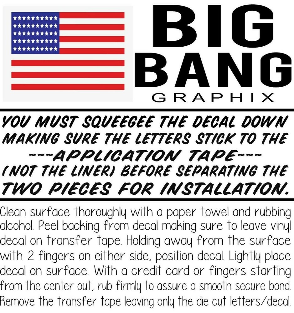 Manufacturer Part Number: Does Not Apply OE/OEM Part Number: N/A Vintage Car Part: No Decals made in & shipped USA: Long lasting Sign Vinyl - 7 yrs Outdoor Rating! Features: Custom Image Suitable For: Car, Caravan, Motorcycle, Trailer, Van, Vehicle Windows Material: Vinyl Attachment Type: Adhesive Placement on Vehicle: Left, Right, Front, Rear, Upper, Lower, Bumper, Front Door Glass, Front Quarter Glass, Fuel Tank, Hood, Rear Door Glass, Rear Quarter Glass, Rear Window, Roof, Side, Tailgate, Windshield Modified Item: No Brand: BIG BANG GRAPHIX Finish: Glossy Theme: Custom Type: Decal Color: White Custom Bundle: No Country/Region of Manufacture: United States Universal Fitment: Yes Non-Domestic Product: No