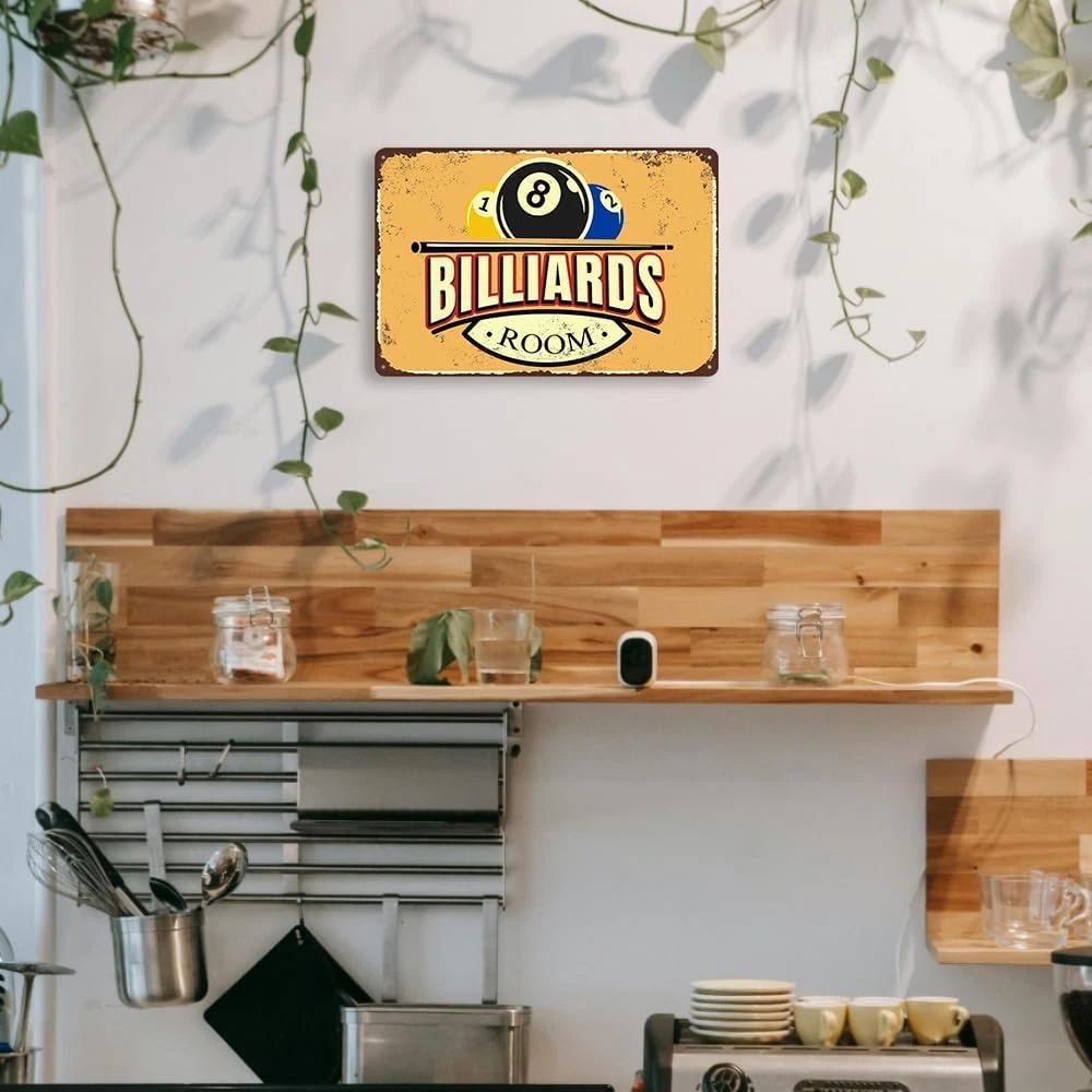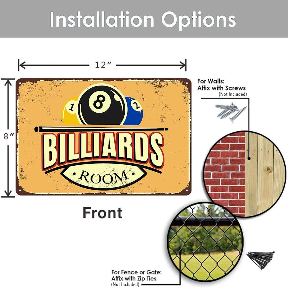 Billiards Room Decor Vintage Metal Tin Sign Size: 8x12 Inches (20x30 Cm). You Will Receive 1 Be printed Billiards Tin Sign Personalized Wall Art Signs Simple And Elegant, And A Humorous Design That Will Bring Laughter To You And Your Friends And Loved Ones! Funny Billiards Tin Sign Usage Scenarios: Vintage Metal Tin Sign Vintage Billiards Poster Suitable For You To Hang Directly On The Wall Or Door Of Your Room, For Kitchen, Dining Room, Living Room, Bedroom, Bathroom, Office, Bar, Cafe, Club, Dorm, Man Cave, Garage, Garden, Street, Hallways, Road, Garag Wall Art Decoration. To Add More Charm To Your Life. Billiards Gifts For Men: Pool Table Accessories Bedroom Sports Signs Inspirational Gifts, Artistic Decoration, Filled With Your Sincere Love, Ideal For Friends, Boys, Girls, Men, Women, Birthday, Anniversary, Christmas, Mother's Day, Father's Day, Thanksgiving, Great Gift For Halloween, Valentine's Day, Easter. Billiards Metal Sign Easy To Hang: Bedroom Sports Signs Funny Metal Tin Sign Inspirational Posters Wall Decor. Each Comes With 4 Pre-Drilled Holes So You Can Install Them Right Away. Just Nail It, Stick It With A Command Bar, Or Hang It With A String (Installation Tools Not Included). Plus, Rolled Edges And Rounded Corners Keep You Safe. These Signs Are Sure To Add Character And Style. Lifetime Satisfaction Service: We Pride Ourselves On Providing Quality Service To Our Customers And Provide Reliable After - Sales Return And Exchange Services. If You Have Any Questions, Please Do Not Hesitate To Contact Us. Billiards Room Decor Funny Billiards Tin Sign Pool Table Accessories Vintage Billiards Poster Billiards Metal Sign Billiards Gifts For Men Billiard Hall Wall Art Decoration 8x12inch
