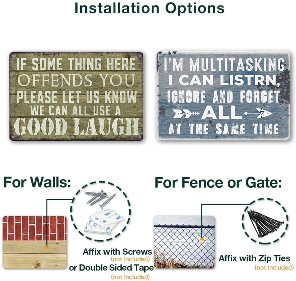 Funny Bar Sign Vintage Metal Tin Garage Signs Man Cave Wall Decor light blue Product Details Mounting Type: Wall Mount Product Dimensions: 12"L x 8"W Shape: Rectangular Style: Vintage Pre-printed: I'm sorry, I can't read Included Components: 2 Metal Signs Item Weight: 12 ounces Manufacturer: wlegebr Item model number: wlegebr008 Batteries required: No Color: light blue Brand: wlegebr Material: Metal Theme: Vintage Recommended Uses For Product: Office FUNNY METAL SIGNS SIZE: 8 x 12 inches (20cmx30cm) You will receive 2 funny signs ,and a humorous design that will bring laughter to you and your friends and loved ones! APPLICABLE SCENE:these funny metal tin signs are suitable for garage ,bar ,home bar,beer wall accessories etc. MATERIAL: these metal tin sign for garage and bar is brand new, The metal painting has a rusty effect, it is printed, not really rusted.made of heavy duty metal, with higher hardness and less bendingHigh quality and environmental protection does not rust ,no fading and can be used for many years. EASY TO INSTALLl: These funny metal signs come with four screw holes and can be installed with double-sided foam tape, command strips or nails for easy hanging THOUGHTFUL SERVICE: If you have any questions about these funny metal signs , please feel free to contact us.